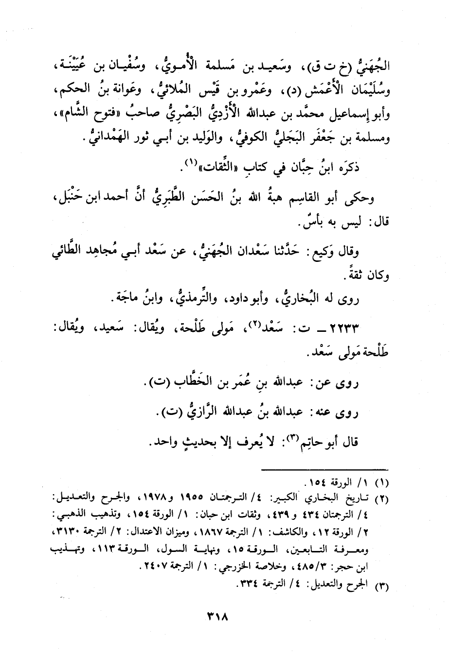 (2) تاريخ البخاري الكبير: 4 / الترجمتان 1955 و1978، والجرح والتعديل: 4 / الترجمتان 434 و439، وثقات ابن حبان: 1 / الورقة 154، وتذهيب الذهبي: 2 / الورقة 12، والكاشف: 1 / الترجمة 1867، وميزان الاعتدال: 2 / الترجمة 3130، ومعرفة التابعين، الورقة 15، ونهاية السول، الورقة 113، وتهذيب ابن حجر: 3 / 485، وخلاصة الخزرجي: 1 / الترجمة 2407.