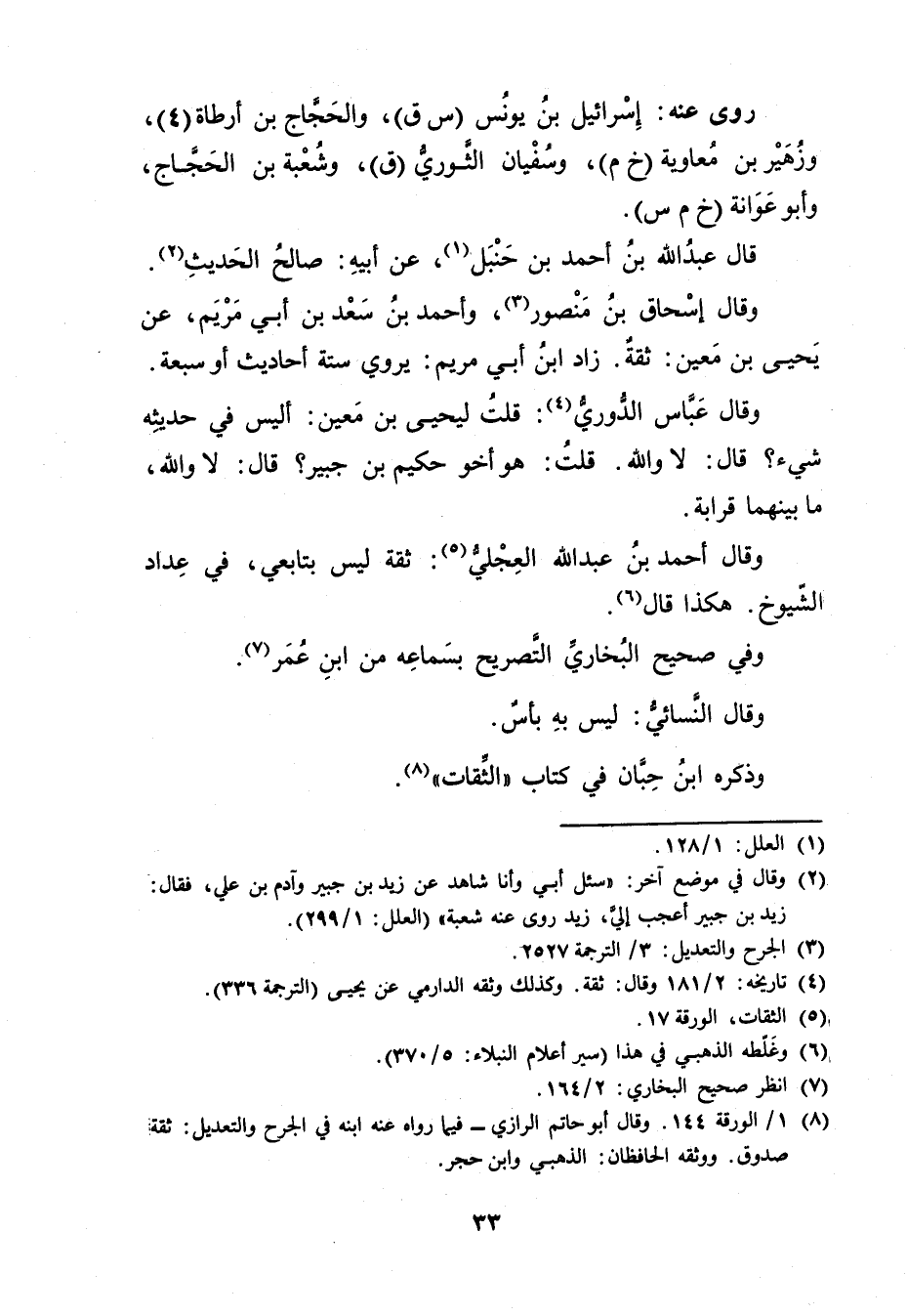 (8) 1 / الورقة 144. وَقَال أبو حاتم الرازي - فيما رواه عنه ابنه في الجرح والتعديل: ثقة صدوق. ووثقه الحافظان: الذهبي وابن حجر.