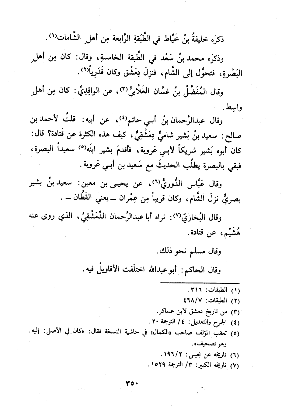 وَقَال عَباس الدُّورِيُّ (6) ، عَنْ يحيى بْن مَعِين: سَعِيد بْن بشير بصري نزل الشام، وكان قريبا من عِمْران، يَعْنِي الْقَطَّان -.