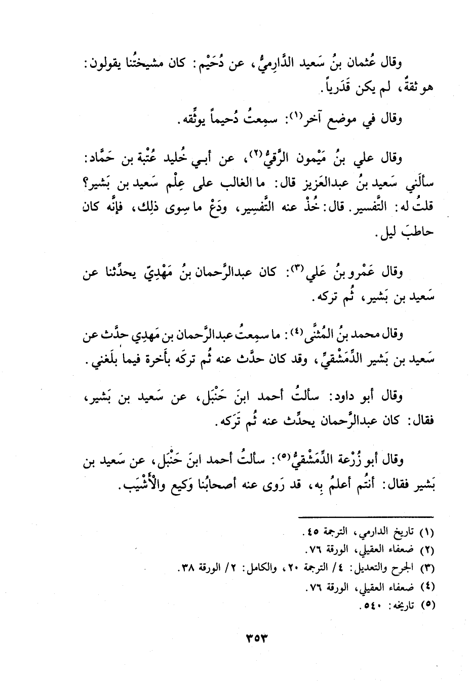 وَقَال أَبُو زُرْعَة الدمشقي (5) : سألت أَحْمَد بن حَنْبَل، عَنْ سَعِيد بْن بشير فَقَالَ: أنتم أعلم بِهِ، قد روى عنه أصحابنا وكِيع والأشيب.