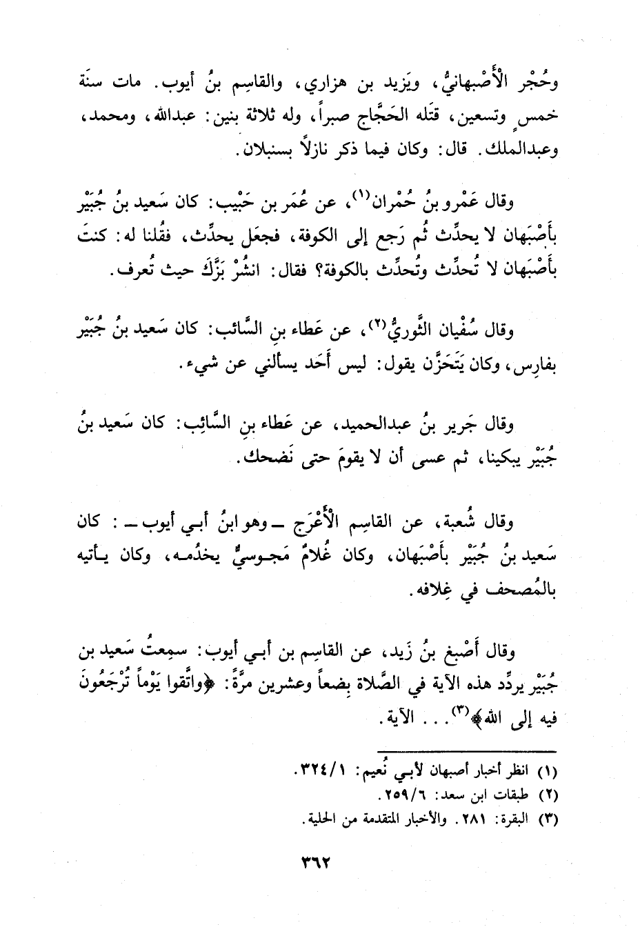 وَقَال أصبغ بْن زيد، عن القاسم بْن أَبي أَيُّوب: سمعت سَعِيد بْن جبير يردد هذه الآية فِي الصلاة بضعا وعشرين مرة: {وَاتَّقُوا يَوْمًا تُرْجَعُونَ فِيهِ إِلَى الله) {3) ... الآية.