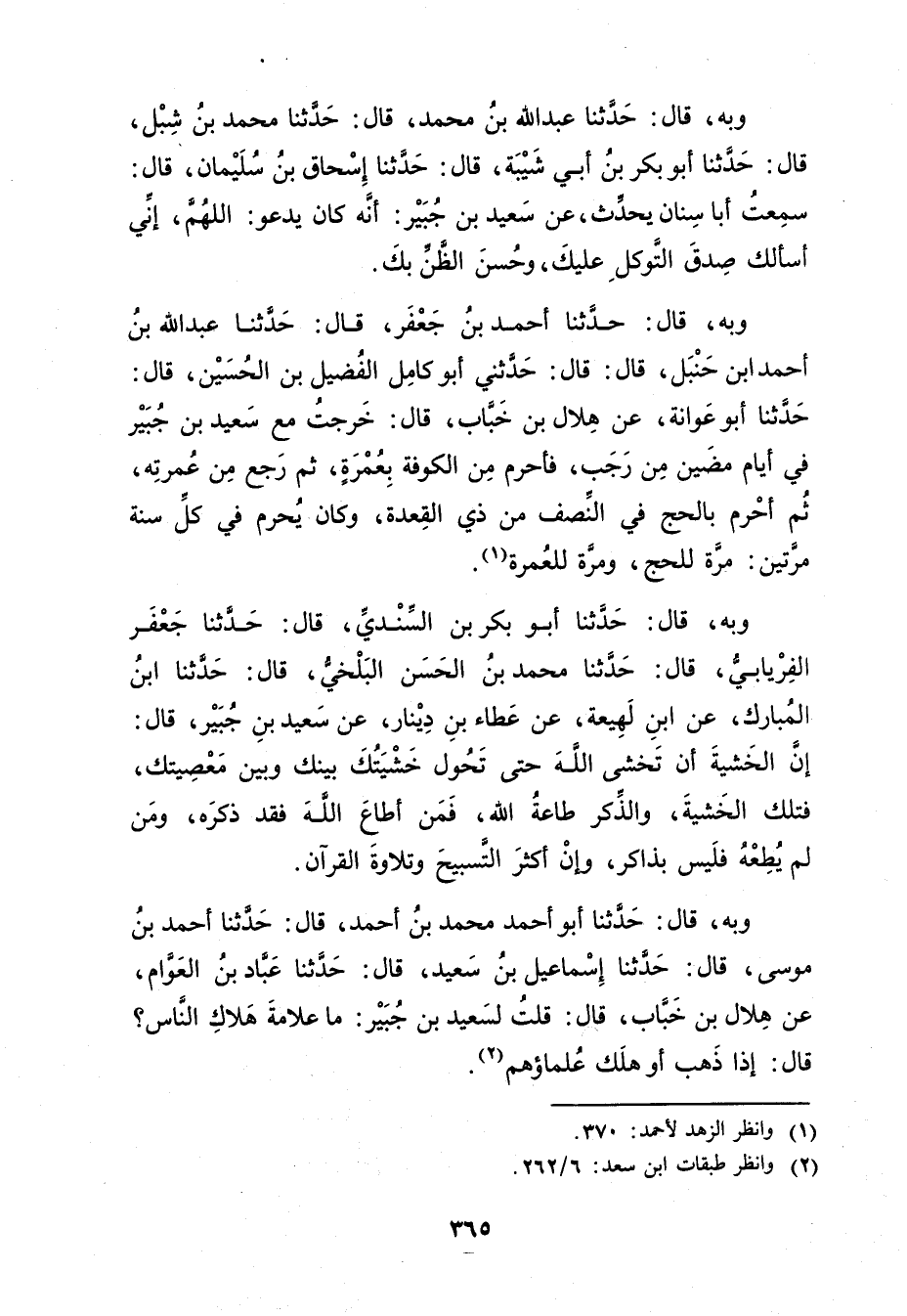 وبه، قال: حَدَّثَنَا أَحْمَدُ بْنُ جعفر، قال: حَدَّثَنَا عَبد اللَّه بْن أَحْمَد بْن حنبل، قال: قال: حَدَّثَنِي أَبُو كَامِل الفضيل بْن الْحُسَيْن، قال: حَدَّثَنَا أَبُو عوانة، عَنْ هِلال بْن خباب، قال: خرجت مع سَعِيد بْن جبير فِي أيام مضين من رجب، فأحرم من الكوفة بعُمَرة، ثُمَّ رجع من عُمَرته، ثُمَّ أحرم بالحج فِي النصف من ذي القعدة، وكان يحرم فِي كل سنة مرتين: مرة للحج، ومرة للعُمَرة (1) .