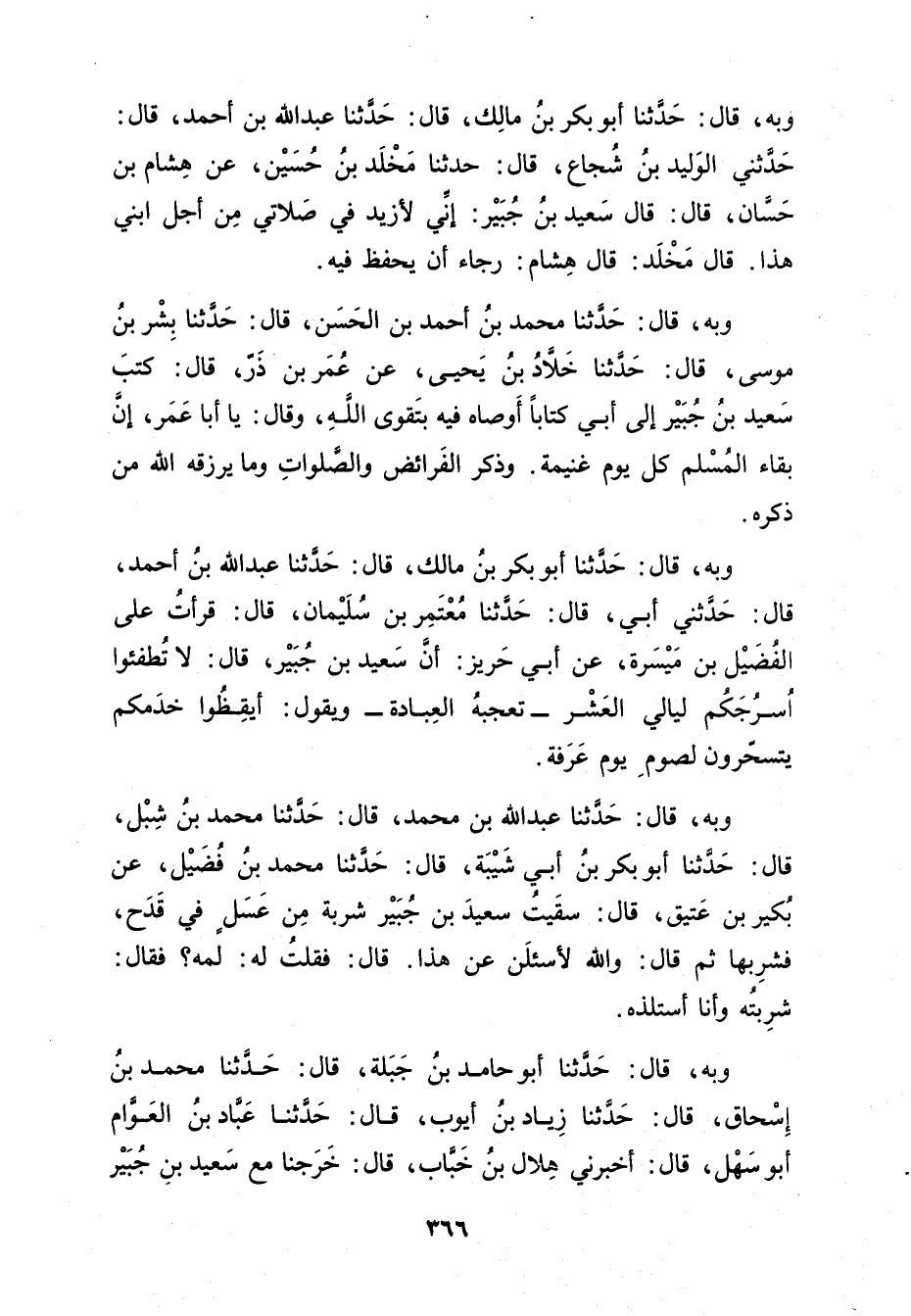 وبه، قال: حَدَّثَنَا أَبُو بَكْرِ بْن مالك، قال: حَدَّثَنَا عَبد اللَّهِ بْن أَحْمَدَ، قال: حَدَّثني أَبِي، قال: حَدَّثَنَا مُعْتَمِرُ بْنُ سُلَيْمان، قال: قرأت على الفضيل بْنُ مَيْسَرَةَ، عَن أَبِي حَرِيزٍ: أن سَعِيد بْن جبير، قال: لا تطفئوا أسرجكم ليالي العشر - تعجبه العبادة - ويقول: أيقظوا خدمكم يتسحرون لصوم يوم عرفة.