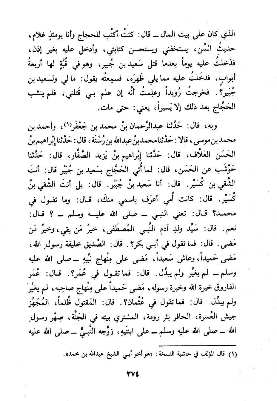 وبه، قال: حَدَّثَنَا عَبْد الرحمن بْن مُحَمَّد بْن جعفر (1) ، وأَحْمَد بْن مُحَمَّد بْن مُوسَى، قَالا: حَدَّثَنَا مُحَمَّدُ بْنُ عَبد اللَّهِ بْنِ رَسْتَةَ، قال: حَدَّثَنَا إِبْرَاهِيم بْن الْحَسَن العلاف، قال: حَدَّثَنَا إِبْرَاهِيم بْن يَزِيد الصفار، قال: حَدَّثَنَا حوشب عَنِ الْحَسَن، قال: لما أتي الحجاج بسَعِيد بْن جبير قال: أنت الشقي بْن كسير. قال: أنا سَعِيد بْن جبير. قال: بل أنت الشقي بْن كسير. قال: كانت أمي أعرف بإسمي منك، قال: وما تقول فِي مُحَمَّد؟ قال: تعني النَّبِيّ صَلَّى اللَّهُ عَلَيْهِ وسَلَّمَ؟ قال: نعم. قال: سيد ولد آدم النَّبِيّ المصطفى، خير من بقي، وخير من مضى. قال: فما تقول فِي أَبِي بَكْر؟.