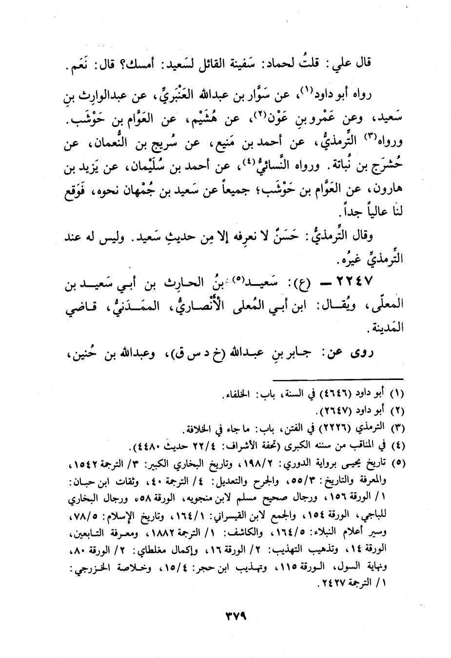 2247 - (ع) : سَعِيد بن الْحَارِث بن أَبي سَعِيد بن الْمُعَلَّى (5) ، ويُقال: ابْن أَبي المعلى الأَنْصارِيّ، الممدني، قاضي الْمَدِينَة.