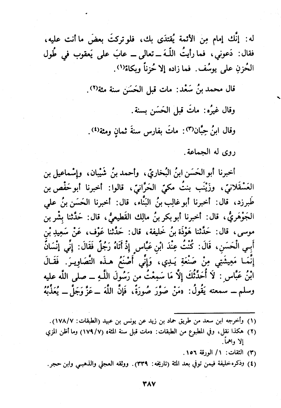 أَخْبَرَنَا أَبُو الْحَسَنِ بْنُ الْبُخَارِيِّ، وأحمد بْنُ شَيْبَانَ، وإِسْمَاعِيلُ بْنُ الْعَسْقَلانِيِّ، وزَيْنَبُ بِنْتُ مَكِّيٍّ الْحَرَّانِيِّ، قَالُوا: أخبرنا أبو حفص بن طَبَرْزَذَ، قال: أَخْبَرَنَا أبو غالب بْن البناء، قال: أخبرنا الحسن بْن علي الجوهري، قال: أَخْبَرَنَا أبو بكر بْن مالك القَطِيعِيّ، قال: حَدَّثَنَا بشر بْن موسى، قال: حَدَّثَنَا هوذة بْن خليفة، قال: حَدَّثَنَا عَوْفٌ، عَنْ سَعِيد بْنِ أَبي الْحَسَنِ، قال: كُنْتُ عِنْدَ ابْنِ عَبَّاسٍ إِذْ أَتَاهُ رَجُلٌ فَقَالَ: إِنِّي إِنْسَانٌ إِنَّمَا مَعِيشَتِي مِنْ صَنْعَةِ يَدِي، وإِنِّي أَصْنَعُ هَذِهِ التَّصَاوِيرَ. فَقَالَ ابْنُ عَبَّاسٍ: لا أُحَدِّثُكَ إِلا مَا سَمِعْتُ من رسول الله صلى الله عَلَيْهِ وسَلَّمَ سَمِعْتُهُ يَقُولُ: مَنْ صوّر صورة، فإن الله - عزوجل - يعذبه