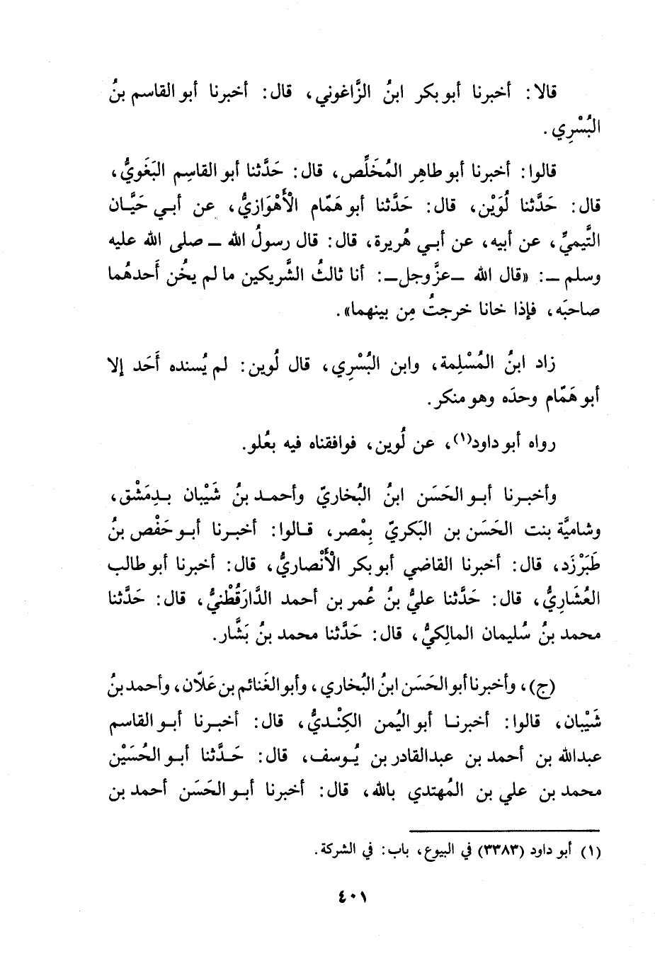 قَالا: أَخْبَرَنَا أَبُو بَكْرِ بْنُ الزَّاغَوَنِيِّ، قال: أخبرنا أَبُو الْقَاسِمِ بْنُ الْبُسْرِيِّ. قَالُوا: أَخْبَرَنَا أَبُو طَاهِرٍ الْمُخَلِّصُ، قال: حَدَّثَنَا أَبُو الْقَاسِمِ الْبَغَوِيُّ، قال: حَدَّثَنَا لُوَيْنٌ، قال: حَدَّثَنَا أَبُو هَمَّامٍ الأَهْوَازِيُّ، عَن أَبِي حَيَّانَ التَّيْمِيّ، عَن أَبِيهِ، عَن أَبِي هُرَيْرة، قال: قال رَسُولُ اللَّهِ صلى الله عليه وسلم: قال الله - عزوجل: أَنَا ثَالِثُ الشَرِيكين مَا لَمْ يَخُنْ أَحَدُهُمَا صَاحِبَهُ، فَإِذَا خَانَا خرجت من بينهما.