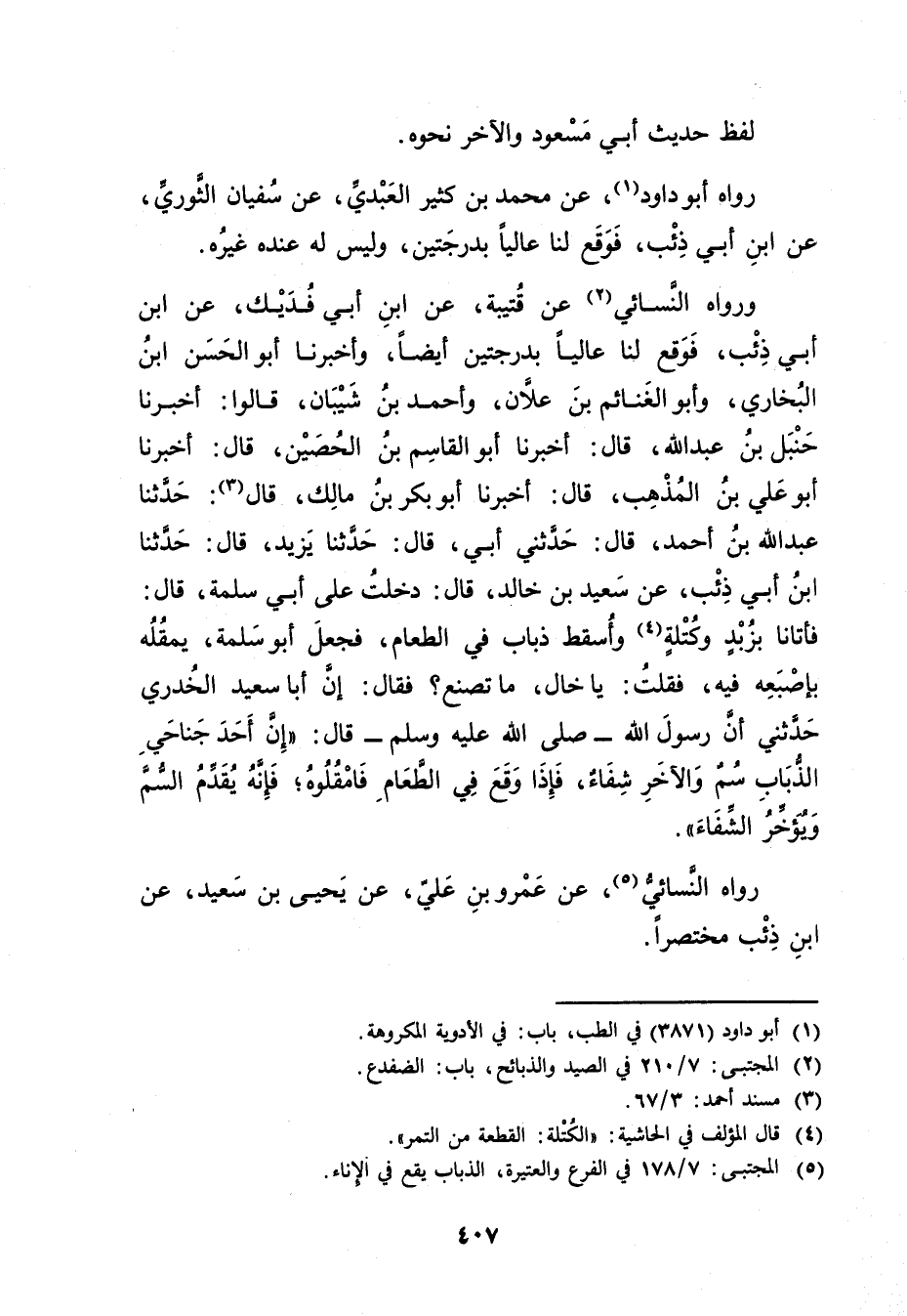 ورواه النَّسَائي (2) عَنْ قُتَيْبَة، عَنِ ابْن أَبي فديك، عَنِ ابْن أَبي ذِئْب، فوقع لنا عاليا بدرجتين أيضا، وأَخْبَرَنَا أَبُو الْحَسَنِ بْنُ الْبُخَارِيِّ، وأَبُو الْغَنَائِمِ بْنُ عَلانَ، وأَحْمَدُ بْنُ شَيْبَانَ، قَالُوا: أَخْبَرَنَا حنبل بْن عَبد الله، قال: أَخْبَرَنَا أبو القاسم بْن الحصين، قال: أَخْبَرَنَا أَبُو علي بْن المذهب، قال: أَخْبَرَنَا أبو بكر بْن مالك، قال (3) : حَدَّثَنَا عَبد اللَّهِ بْن أَحْمَدَ، قال: حَدَّثني أَبِي، قال: حَدَّثَنَا يَزِيدُ، قال: حَدَّثَنَا ابْنُ أَبي ذِئْبٍ، عَنْ سَعِيد بْنِ خَالِدٍ، قال: دَخَلْتُ عَلَى أَبِي سَلَمَةَ، قال: فَأَتَانَا بزبد وكتلة (4) وأسقط ذباب فِي الطَّعَامِ، فَجَعَلَ أَبُو سَلَمَةَ، يَمْقُلُهُ بِإِصْبَعِهِ فِيهِ، فَقُلْتُ: يَا خَالِ، مَا تَصْنَعُ؟ فَقَالَ: إِنَّ أَبَا سَعِيد الخُدْرِيّ حَدَّثَنِي أَنَّ رَسُول اللَّهِ صلى الله عليه وسَلَّمَ قال: إِنَّ أَحَدَ جَنَاحَيِ الذُّبَابِ سُمٌّ والآخَرُ شِفَاءٌ، فَإِذَا وقَعَ فِي الطَّعَامِ فَامْقُلُوهُ، فَإِنَّهُ يُقَدِّمُ السُّمَّ ويُؤَخِّرُ الشِّفَاءَ.