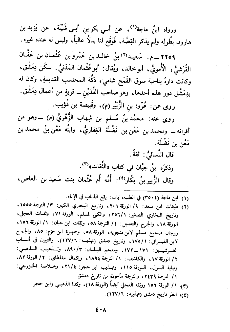 (2) طبقات ابن سعد: 9 / الورقة 201، وتاريخ البخاري الكبير: 3 / الترجمة 1555، وتاريخ البخاري الصغير: 1 / 256، والكنى لمسلم، الورقة 71، وثقات العجلي، الورقة 18، والجرح والتعديل: 4 / الترجمة 58، وثقات ابن حبان: 1 / الورقة 156، ورجال صحيح مسلم لابن منجويه، الورقة 58، وجمهرة ابن حزم: 85، والجمع لابن القيسراني: 1 / 175، وتاريخ دمشق (تهذيبه: 6 / 127) ، والتبيين في أنساب القرشيين: 171 - 172، ومعجم البلدان: 3 / 890، وتذهيب الذهبي: 2 / الورقة 17، والكاشف: 1 / الترجمة 1894، وإكمال مغلطاي: 2 / الورقة 82، ونهاية السول، الورقة 115، وتهذيب ابن حجر: 4 / 21، وخلاصة الخزرجي: 1 / الترجمة 2439، والترجمة مأخوذة من تاريخ دمشق.