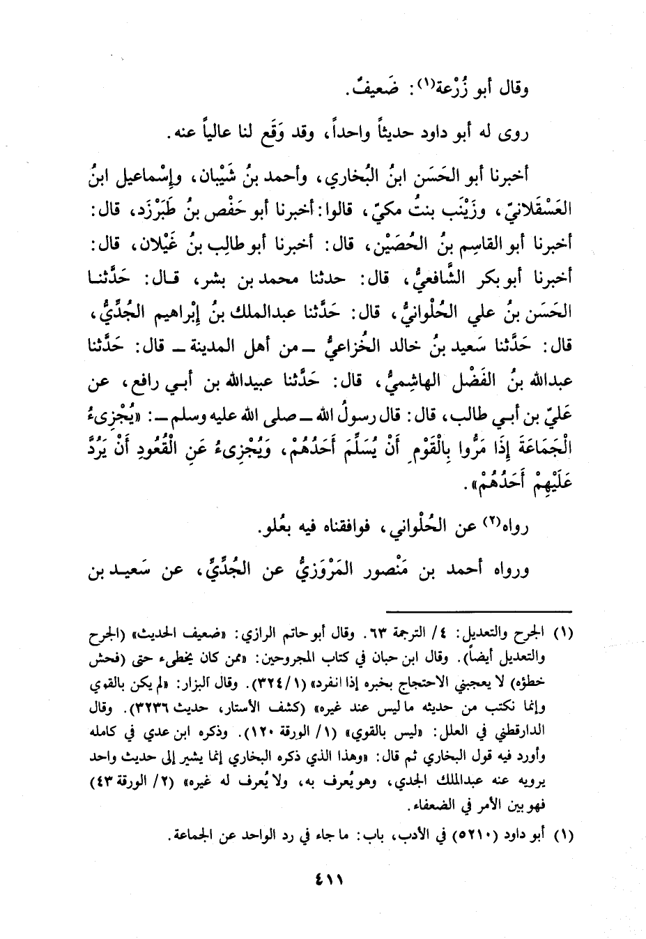 أَخْبَرَنَا أَبُو الْحَسَنِ بْنُ الْبُخَارِيِّ، وأحمد بن شَيْبَانَ، وإسماعيل ابن الْعَسْقَلانِيِّ، وزَيْنَبُ بِنْتُ مَكِّيٍّ، قَالُوا: أخبرنا أبو حفص بن طَبَرْزَذَ، قال: أَخْبَرَنَا أبو القاسم بْن الحصين، قال: أخبرنا أَبُو طالب بْنُ غَيْلانَ، قال: أَخْبَرَنَا أَبُو بَكْرٍ الشَّافِعِيُّ، قال: حَدَّثَنَا مُحَمَّدُ بْنُ بِشْرٍ، قال: حَدَّثَنَا الْحَسَنُ بْنُ عَلِيٍّ الْحُلْوَانِيُّ، قال: حَدَّثَنَا عَبد المَلِك بْن إبراهيم الجدي، قال: حَدَّثَنَا سَعِيد بْنُ خَالِدٍ الْخُزَاعِيُّ - مِنْ أَهْلِ الْمَدِينَةِ، قال: حَدَّثَنَا عَبد اللَّهِ بْنُ الْفَضْلِ الْهَاشِمِيُّ، قال: حَدَّثَنَا عُبَيد اللَّهِ بْنُ أَبي رَافِعٍ، عَنْ عَلِيِّ بْنِ أَبي طَالِبٍ، قال: قال رَسُول اللَّهِ صلى الله عليه وسَلَّمَ: يُجْزِئُ الْجَمَاعَةَ إِذَا مَرُّوا بِالْقَوْمِ أَنْ يُسَلِّمَ أَحَدُهُمْ، ويُجْزِئُ عَنِ الْقُعُودِ أَنْ يَرُدَّ عَلَيْهِمْ أَحَدُهُمْ.