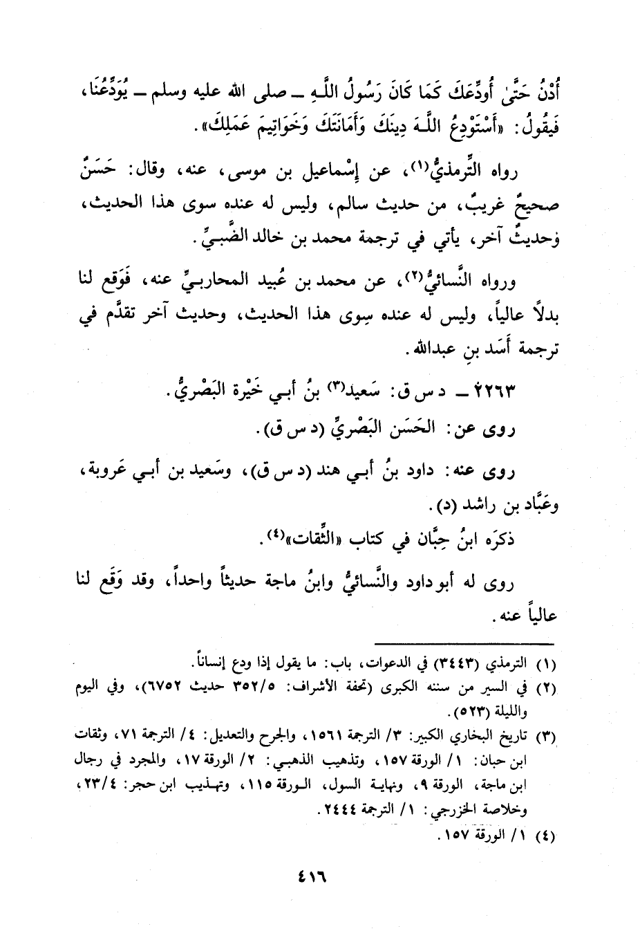 (3) تاريخ البخاري الكبير: 3 / الترجمة 1561، والجرح والتعديل: 4 / الترجمة 71، وثقات ابن حبان: 1 / الورقة 157، وتذهيب الذهبي: 2 / الورقة 17، والمجرد في رجال ابن ماجة، الورقة 9، ونهاية السول، الروقة 115، وتهذيب ابن حجر: 4 / 23، وخلاصة الخزرجي: 1 / الترجمة 2444.