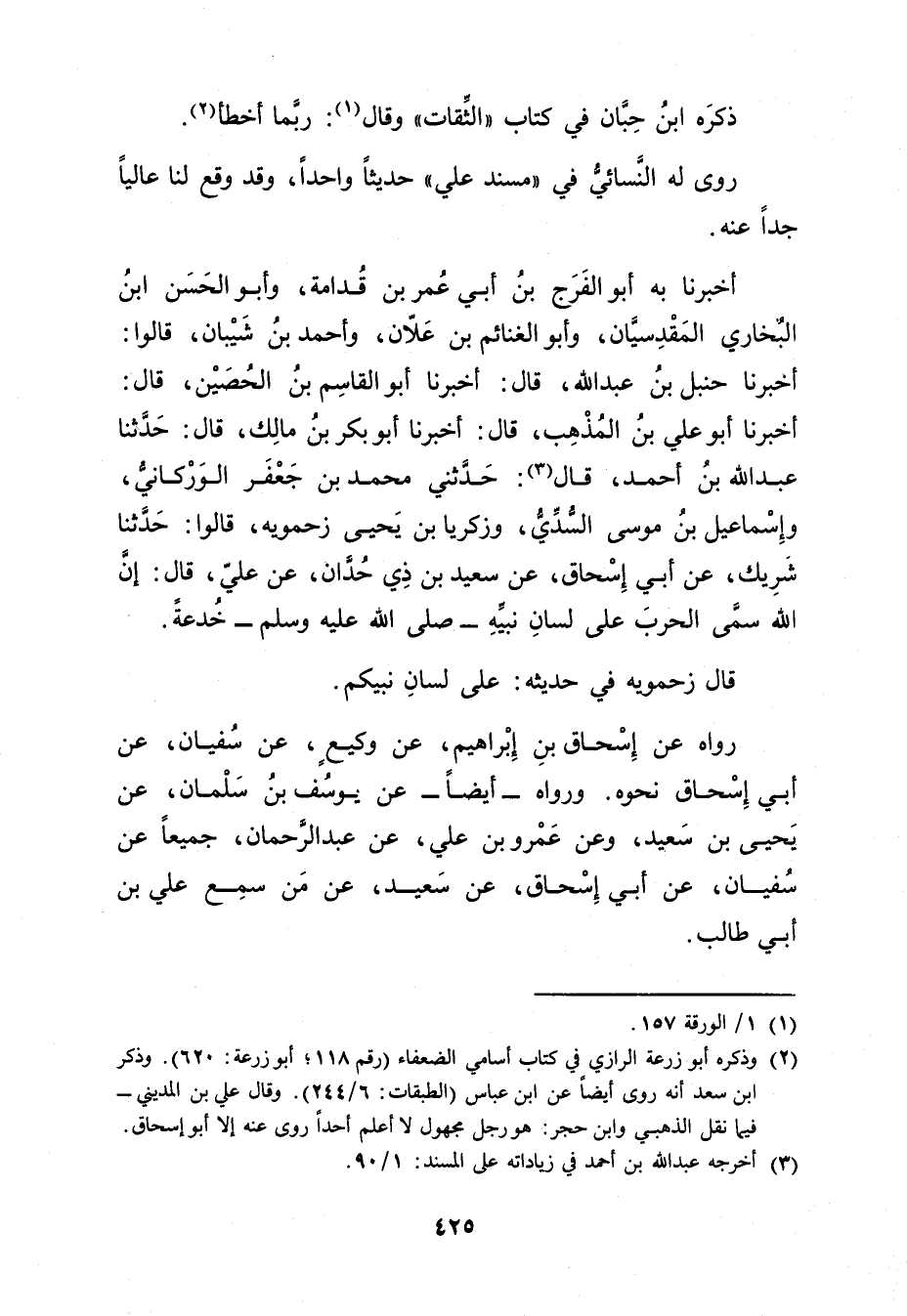 أَخْبَرَنَا بِهِ أَبُو الْفَرَجِ بْنُ أَبي عُمَر بْنِ قُدَامَةَ، وأَبُو الْحَسَنِ بْنُ الْبُخَارِيِّ الْمَقْدِسِيَّانِ، وأَبُو الْغَنَائِمِ بْنُ عَلانَ، وأَحْمَدُ بْنُ شَيْبَانَ، قَالُوا: أَخْبَرَنَا حنبل بْن عَبد الله، قال: أَخْبَرَنَا أبو القاسم بْن الحصين، قال: أَخْبَرَنَا أَبُو علي بْن المذهب، قال: أَخْبَرَنَا أبو بكر بْن مالك، قال: حَدَّثَنَا عَبد اللَّهِ بْن أَحْمَدَ، قال (3) : حدثني مُحَمَّدُ بْنُ جَعْفَرٍ الْوَرْكَانِيُّ، وإِسْمَاعِيلُ بْنُ مُوسَى السُّدِّيُّ، وزَكَرِيَّا بْنُ يَحْيَى زَحْمَوَيْهِ، قَالُوا: حَدَّثَنَا شَرِيك، عَن أَبِي إِسْحَاقَ، عن سَعِيد بْنِ ذِي حُدَّانَ، عَنْ عَلِيٍّ، قال: إِنَّ اللَّهَ سَمَّى الْحَرْبَ عَلَى لِسَانِ نَبِيِّهِ صَلَّى اللَّهُ عَلَيْهِ وسَلَّمَ خُدْعَةً.