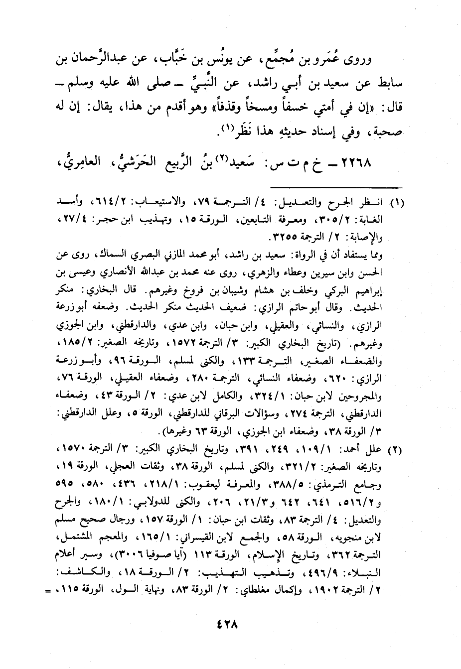 2268 - خ م ت س: سَعِيد بن الربيع الحرشي (2) ، العامري، (1) انظر الجرح والتعديل: 4 / الترجمة 79، والاستيعاب: 2 / 614، وأسد الغابة: 2 / 305، ومعرفة التابعين، الورقة 15، وتهذيب ابن حجر: 4 / 27، والاصابة: 2 / الترجمة 3255. ومما يستفاد أن في الرواة: سَعِيد بن راشد، أبو محمد المازني البَصْرِيّ السماك، روى عن الحسن وابن سيرين وعطاء والزُّهْرِيّ، روى عنه مُحَمَّد بْن عَبد الله الأَنْصارِيّ وعيسى بن إبراهيم البركي وخلف بن هشام وشيبان بن فروخ وغيرهم. قال الْبُخَارِيّ: منكر الحديث. وَقَال أبو حاتم الرازي: ضعيف الحديث منكر الحديث. وضعفه أبو زُرْعَة الرازي، والنَّسَائي، والعقيلي، وابن حبان، وابن عدي، والدارقطني، وابن الجوزي وغيرهم. (تاريخ البخاري الكبير: 3 / الترجمة 1572، وتاريخه الصغير: 2 / 185، والضعفاء الصغير، الترجمة 133، والكنى لمسلم، الورقة 96، وأبو زُرْعَة الرازي: 620، وضعفاء النَّسَائي، الترجمة 280، وضعفاء العقيلي، الورقة 76، والمجروحين لابن حبان: 1 / 324، والكامل لابن عدي: 2 / الورقة 43، وضعفاء الدارقطني، الترجمة 274، وسؤالات البرقاني للدارقطني، الورقة 5، وعلل الدارقطني: 3 / الورقة 38، وضعفاء ابن الجوزي، الورقة 63 وغيرها) .