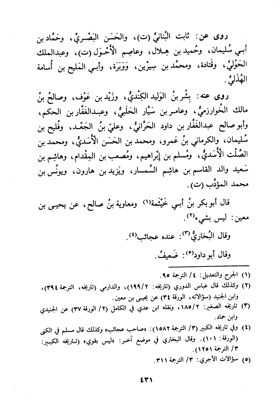 (4) وفي تاريخه الكبير (3 / الترجمة 1582) : صاحب عجائب"وكذلك قال مسلم في الكنى (الورقة: 101) . وقَال البُخارِيُّ فِي موضع آخر: ليس بقوي" (تاريخه الكبير: 3 / الترجمة 1251) .