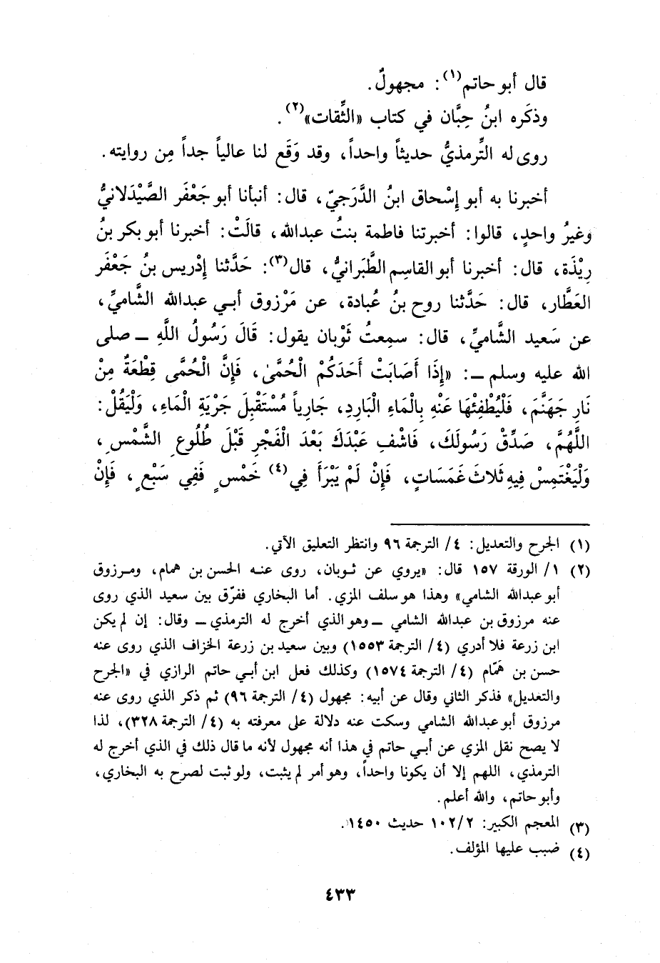 (2) 1 / الورقة 157 قال: يروي عن ثوبان، روى عنه الْحَسَن بْن همام، ومرزوق أَبُو عَبْد اللَّهِ الشامي"وهذا هو سلف المزي. أما البخاري ففرق بين سَعِيد الذي روى عنه مرزوق بن عَبد الله الشامي - هو الذي أخرج له التِّرْمِذِيّ - وَقَال: إن لم يكن ابن زرعة فلا أدري (4 / الترجمة 1553) وبين سَعِيد بن زرعة الخزاف الذي روى عنه حسن بن همام (4 / الترجمة 1574) وكذلك فعل ابن أَبي حاتم الرازي في "الجرح والتعديل"فذكر الثاني وَقَال عَن أبيه: مجهول (4 / الترجمة 96) ثم ذكر الذي روى عنه مرزوق أَبُو عَبْد اللَّهِ الشامي وسكت عنه دلالة على معرفته به (4 / الترجمة 328) ، لذا لا يصح نقل المزي عَن أبي حاتم في هذا أنه مجهول لانه ما قال ذلك في الذي أخرج له التِّرْمِذِيّ، اللهم إلا أن يكونا واحدًا، وهو أمر لم يثبت، ولو ثبت لصرح به البخاري، وأبو حاتم، والله أعلم.