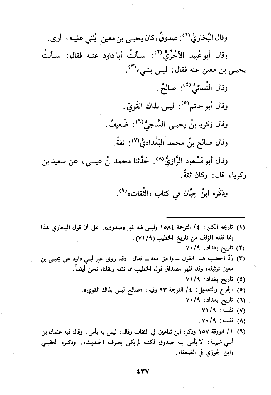(9) 1 / الورقة 157 وذكره ابن شاهين في الثقات وَقَال: ليس به بأس. وَقَال فيه عثمان بن أَبي شَيْبَة: لا بأس به صدوق لكنه لم يكن يعرف الحديث". وذكره العقيلي وابن الجوزي في الضعفاء.