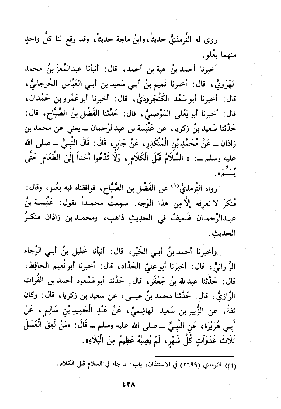 أخبرنا أحمد بن هبة بن أحمد، قال: أنبأنا عبد المعز بْنُ مُحَمَّدٍ الْهَروي، قال: أَخْبَرَنَا تميم بْن أَبي سَعِيد بْن أَبي العباس الجرجاني، قال: أخبرنا أَبُو سَعْدٍ الْكَنْجَرُوذِيُّ، قال: أخبرنا أَبُو عَمْرو بْنُ حَمْدَانَ، قال: أخبرنا أَبُو يَعْلَى الموصلي، قال: حَدَّثَنَا الْفَضْلُ بْنُ الصَّبَّاحِ، قال: حَدَّثَنَا سَعِيد بْنُ زَكَرِيَّا، عَنْ عَنْبَسَةَ بْنِ عَبْدِ الرَّحْمَنِ، يَعْنِي عَنْ مُحَمَّدِ بْنِ زَاذَانَ، عَن مُحَمَّد بْن المنكدر، عَنْ جابر، قال: قال النبي صَلَّى اللَّهُ عَلَيْهِ وسَلَّمَ: السَّلامُ قَبْلَ الْكَلامِ، ولا تَدْعُوا أَحَدًا إِلَى الطَّعَامِ حَتَّى يُسَلِّمَ.