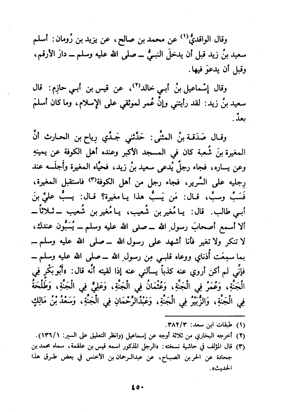 وَقَال الواقدي (1) عَنْ مُحَمَّد بْن صَالِح، عَنْ يَزِيد بْن رومان: أسلم سَعِيد بْن زَيْد قبل أن يدخل النَّبِيّ صَلَّى اللَّهُ عَلَيْهِ وسَلَّمَ دار الأَرقم، وقبل أن يدعو فيها.