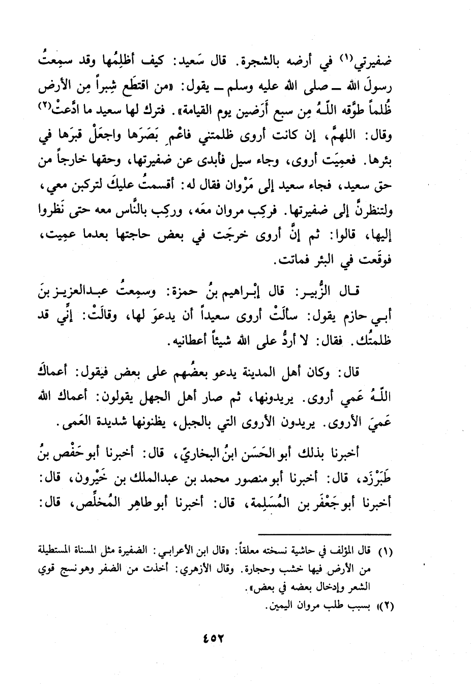 ضَفِيرَتِي (1) فِي أَرْضِهِ بِالشَّجَرَةِ. قال سَعِيد: كَيْفَ أَظْلِمُهَا وقَدْ سَمِعْتُ رَسُول اللَّهِ صلى الله عليه وسَلَّمَ يَقُولُ: مَنِ اقْتَطَعَ شِبْرًا مِنَ الأَرْضِ ظُلْمًا طَوَّقَهُ اللَّهُ مِنْ سَبْعِ أَرَضِينَ يَوْمَ الْقِيَامَةِ". فترك لها سَعِيد ما ادعت (2) وَقَال: اللهم، إن كانت أروى ظلمتني فاعم بصرها واجعل قبرها فِي بئرها. فعميت أروى، وجاء سيل فأبدى عَنْ ضفيرتها، وحقها خارجا من حق سَعِيد، فجاء سَعِيد إِلَى مروان فَقَالَ لَهُ: أقسمت عليك لتركبن معي، ولتنظرن إِلَى ضفيرتها. فركب مروان معه، وركب بالناس معه حَتَّى نظروا إليها، قَالُوا: ثُمَّ إن أروى خرجت فِي بعض حاجتها بعدما عميت، فوقعت فِي البئر فماتت.