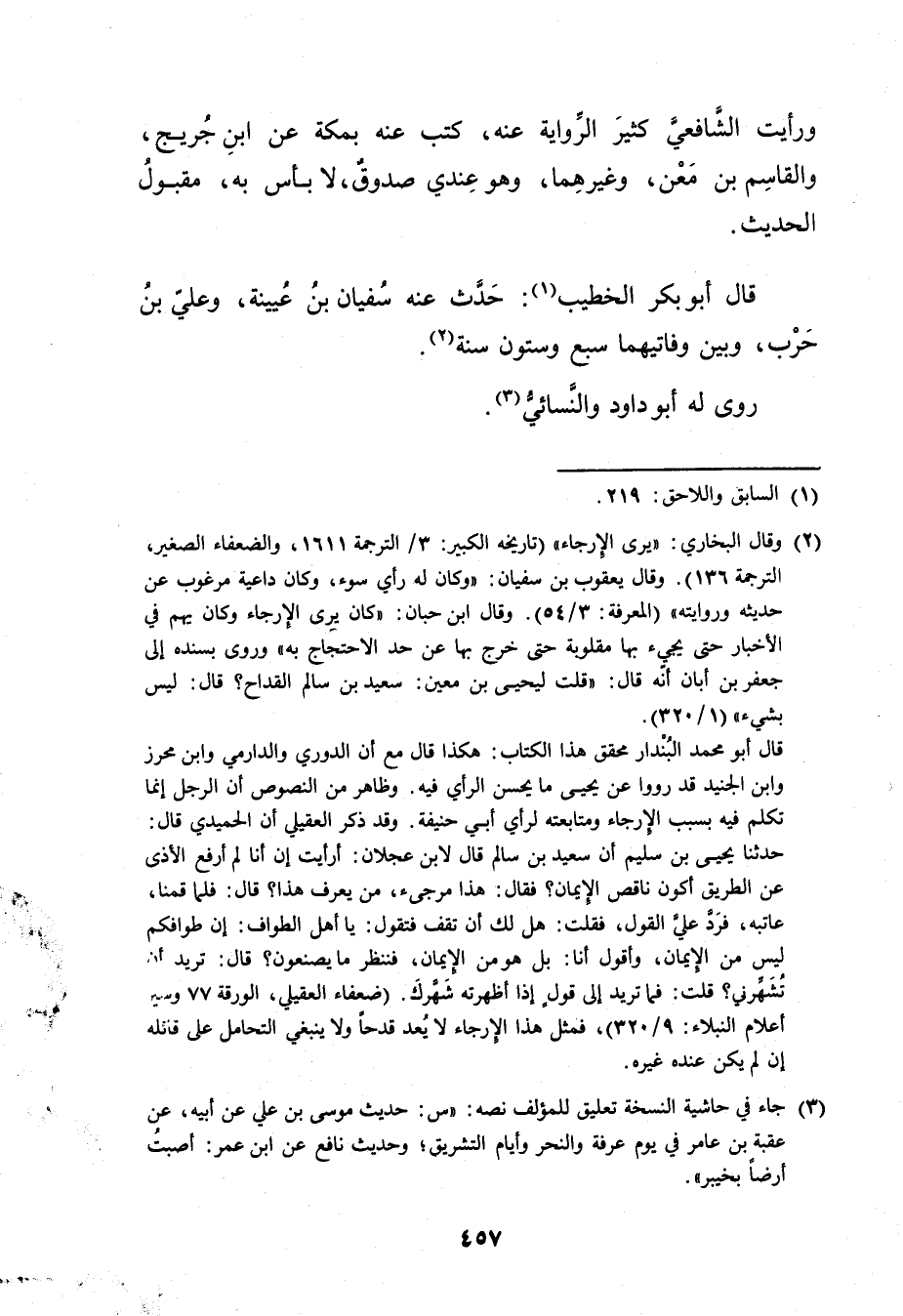 (2) وقَال البُخارِيُّ: يرى الارجاء" (تاريخه الكبير: 3 / الترجمة 1611، والضعفاء الصغير، الترجمة 136) . وَقَال يعقوب بن سفيان: وكان له رأي سوء، وكان داعية مرغوب عن حديثه وروايته" (المعرفة: 3 / 54) . وَقَال ابن حبان: كان يرى الارجاء وكان يهم في الاخبار حتى يجئ بها مقلوبة حتى خرج بها عن حد الاحتجاج به"وروى بسنده إلى جعفر بن أبان أنه قال: قلت ليحيى بن مَعِين: سَعِيد بن سالم القداح؟ قال: ليس بشيءٍ" (1 / 320) . قال أبو محمد البندار محقق هذا الكتاب: هكذا قال مع أن الدوري والدارمي وابن محرز وابن الجنيد قد رووا عن يحيى ما يحسن الرأي فيه. وظاهر من النصوص أن الرجل إنما تكلم فيه بسبب الارجاء ومتابعته لرأي أبي حنيفة. وقد ذكر العقيلي أن الحميدي قال: حَدَّثَنَا يحيى بن سليم أن سَعِيد بن سالم قال لابن عجلان: أرأيت إن أنا لم أرفع الاذى عن الطريق أكون ناقص الايمان؟ فقال: هذا مرجئ، من يعرف هذا؟ قال: فلما قمنا، عاتبه، فرد علي القول، فقلت: هل لك أن تقف فتقول: يا أهل الطواف: إن طوافكم ليس من الايمان، وأقول أنا: بل هو من الايمان، فننظر ما يصنعون؟ قال: تريد أن تشهرني؟ قلت: فما تريد إلى قول إذا أظهرته شهرك. (ضعفاء العقيلي، الورقة 77 وسير أعلام النبلاء: 9 / 320) ، فمثل هذا الارجاء لا يعد قدحا ولا ينبغي التحامل على قائله إن لم يكن عنده غيره.