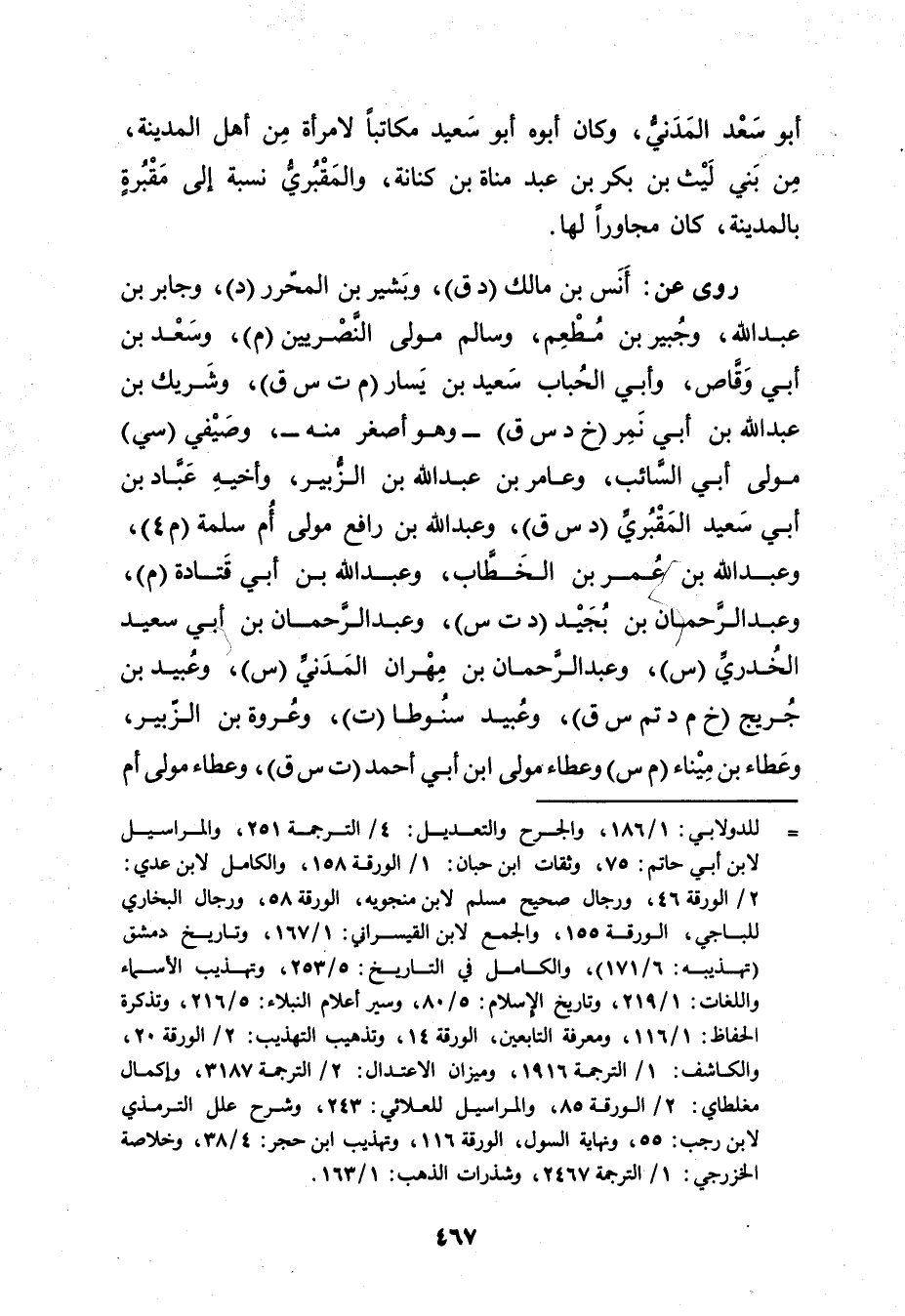 = للدولابي: 1 / 186، والجرح والتعديل: 4 / الترجمة 251، والمراسيل لابن أَبي حاتم: 75، وثقات ابن حبان: 1 / الورقة 158، والكامل لابن عدي: 2 / الورقة 46، ورجال صحيح مسلم لابن منجويه، الورقة 58، ورجال البخاري للباجي، الورقة 155، والجمع لابن القيسراني: 1 / 167، وتاريخ دمشق (تهذيبه: 6 / 171) ، والكامل في التاريخ: 5 / 253، وتهذيب الأَسماء واللغات: 1 / 219، وتاريخ الاسلام: 5 / 80، وسير أعلام النبلاء: 5 / 216، وتذكرة الحفاظ: 1 / 116، ومعرفة التابعين، الورقة 14، وتذهيب التهذيب: 2 / الورقة 20، والكاشف: 1 / الترجمة 1916، وميزان الاعتدال: 2 / الترجمة 3187، وإكمال مغلطاي: 2 / الورقة 85، والمراسيل للعلائي: 243، وشرح علل التِّرْمِذِيّ لابن رجب: 55، ونهاية السول، الورقة 116، وتهذيب ابن حجر: 4 / 38، وخلاصة الخزرجي: 1 / الترجمة 2467، وشذرات الذهب: 1 / 163.