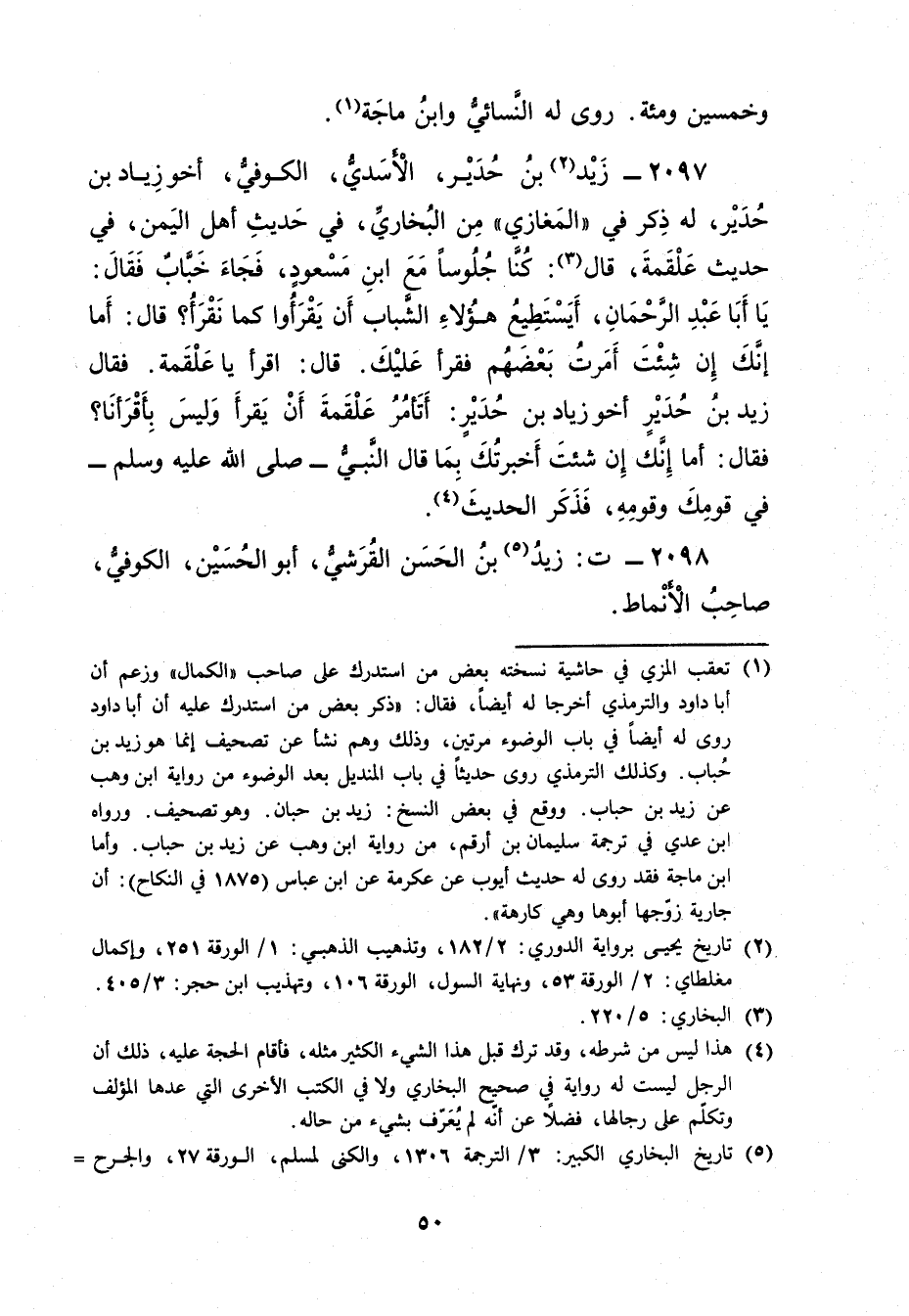 2097 - زَيْد بن حدير (2) ، الأسدي، الْكُوفِيّ، أخو زِيَاد بْن حدير، لَهُ ذكر فِي "المغازي"من الْبُخَارِيّ، فِي حديث أهل الْيَمَن، فِي حديث عَلْقَمَة، قال (3) : كنا جلوسا مع ابْن مَسْعُود، فجاء خباب فَقَالَ: يَا أَبَا عَبْدِ الرَّحْمَنِ، أيستطيع هؤلاء الشباب أن يقرأوا كما نقرأ؟ قال: أما إنك إن شئت أمرت بعضهم فقرأ عليك. قال: اقرأ يَا عَلْقَمَة. فَقَالَ زَيْد بْن حدير أخو زِيَاد بْن حدير: أتأمر عَلْقَمَة أن يقرأ وليس بأقرأنا؟ فَقَالَ: أما إنك إن شئت أخبرتك بما قال النَّبِيّ صَلَّى اللَّهُ عَلَيْهِ وسَلَّمَ فِي قومك وقومه، فذكر الحديث (4) .