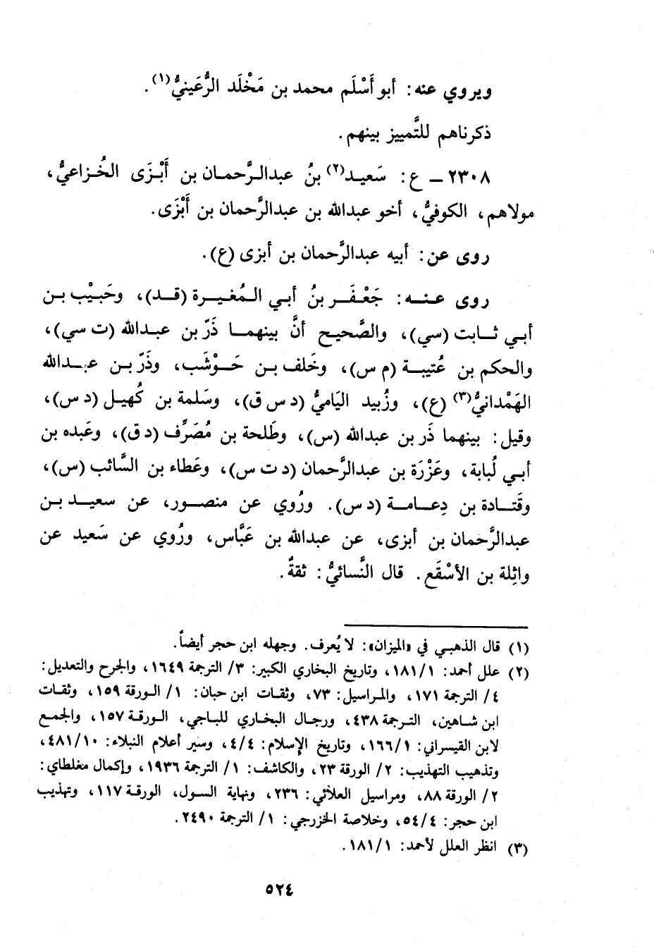 2308 - ع: سَعِيد بن عَبْد الرَّحْمَنِ بن أبزى الْخُزَاعِيّ (2) ، مولاهم، الكوفي، أخو عَبد الله بْن عَبْد الرَّحْمَنِ بْن أبزى.