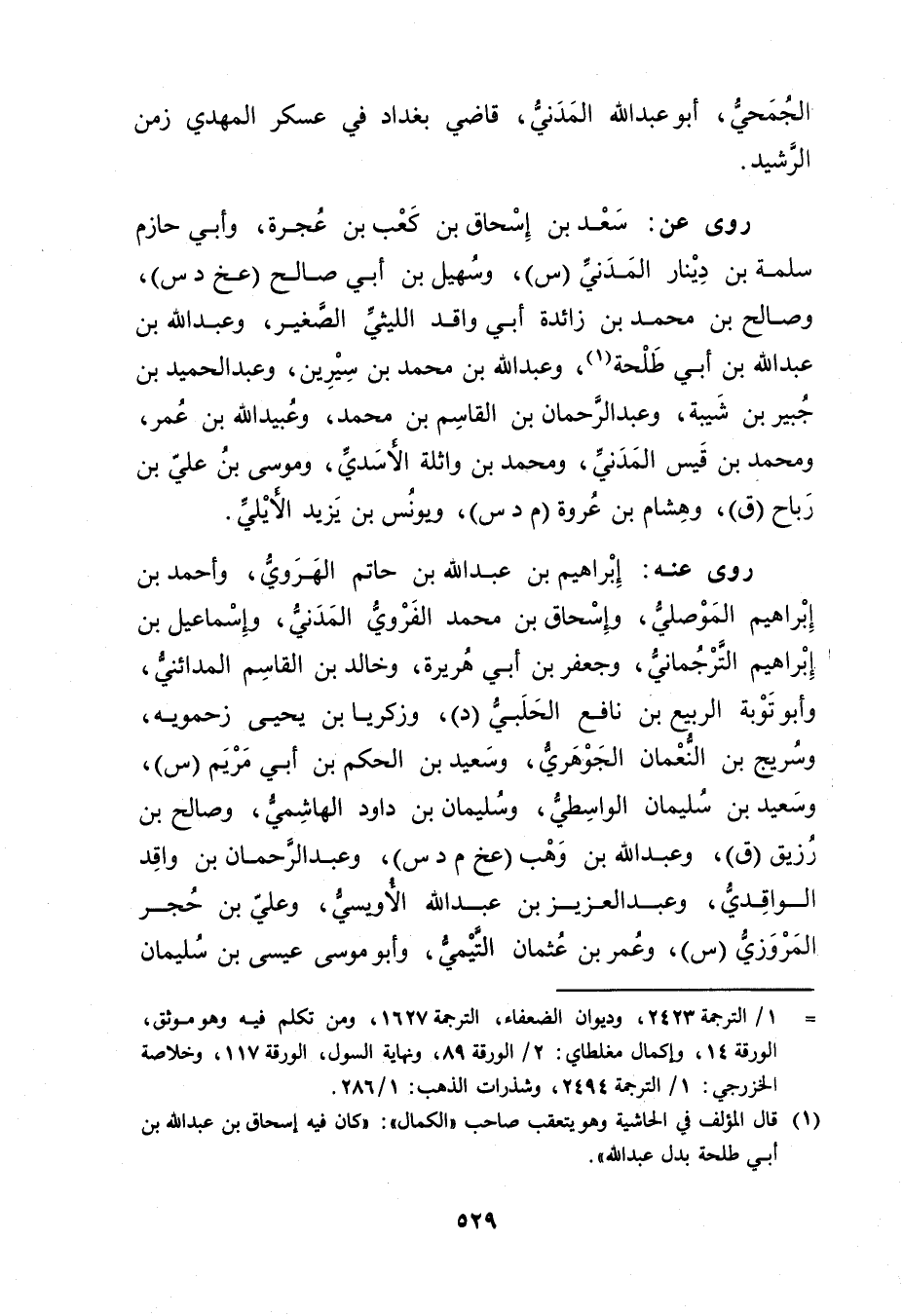 الجمحي، أبو عَبد اللَّهِ الْمَدَنِيّ، قاضي بغداد فِي عسكر المهدي زمن الرشيد.