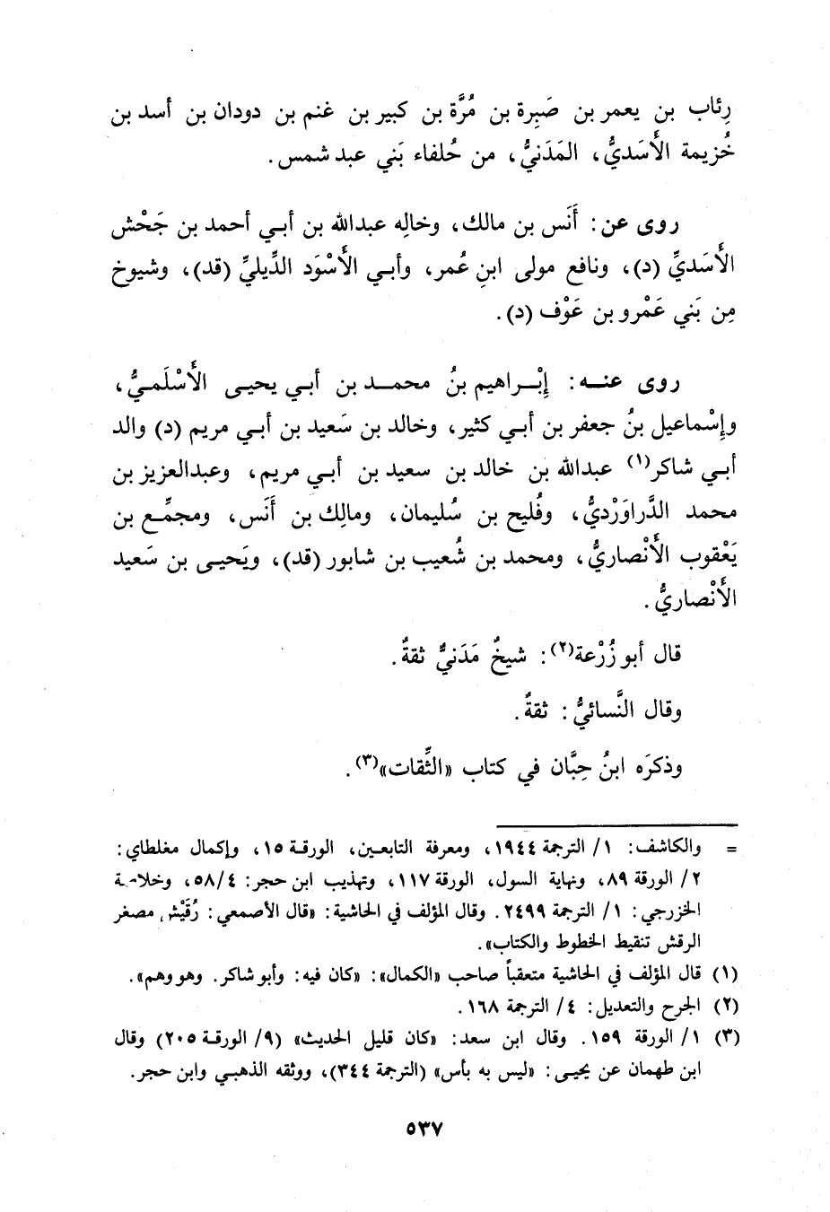 = والكاشف: 1 / الترجمة 1944، ومعرفة التابعين، الورقة 15، وإكمال مغلطاي: 2 / الورقة 89، ونهاية السول، الورقة 117، وتهذيب ابن حجر: 4 / 58، وخلاصة الخزرجي: 1 / الترجمة 2499. وَقَال المؤلف في الحاشية: قال الأَصْمَعِيّ: رقيش مصغر الرقش تنقيط الخطوط والكتاب.