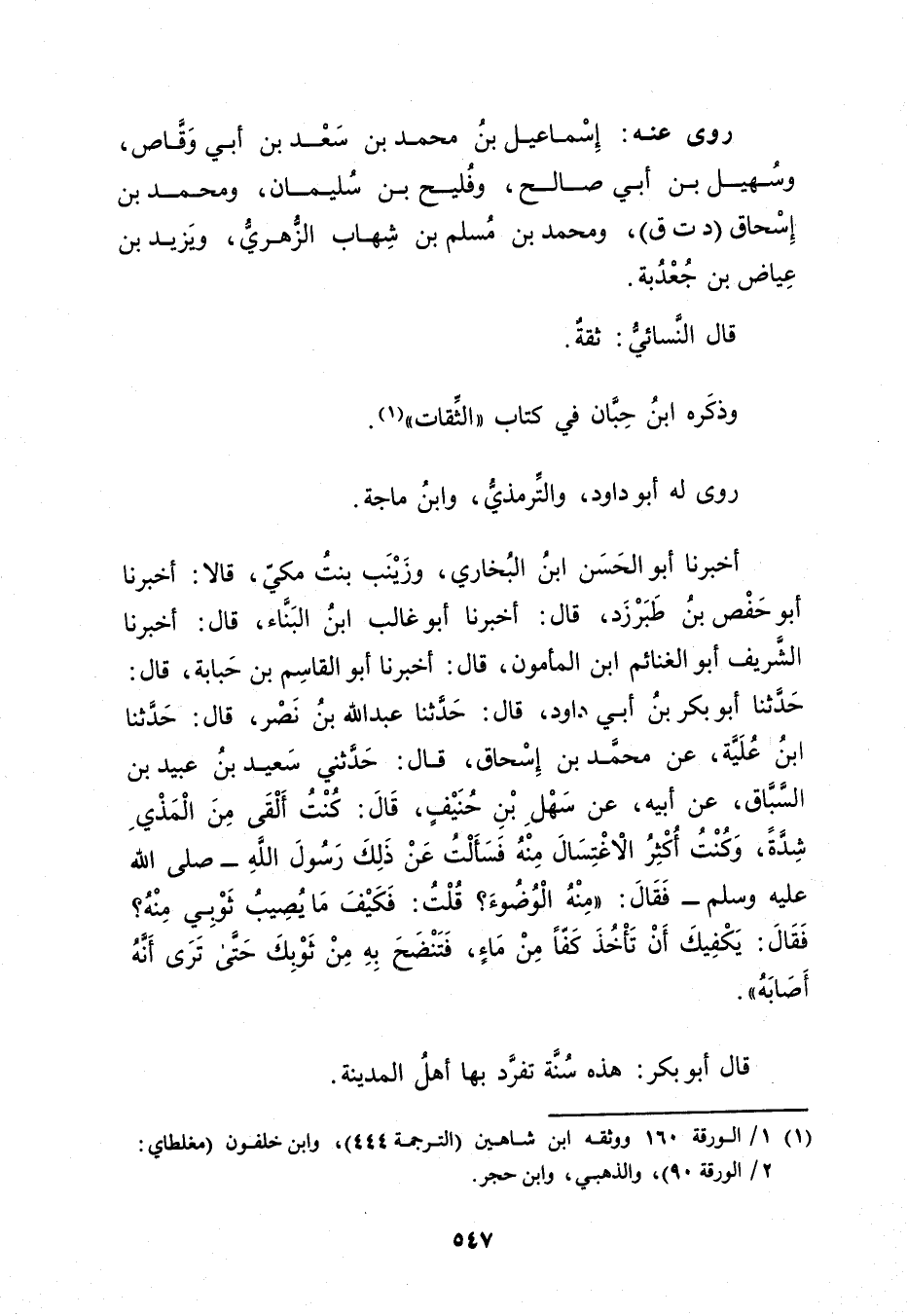 أَخْبَرَنَا أَبُو الْحَسَنِ بْنُ الْبُخَارِيِّ، وزينب بنت مكي، قَالا: أخبرنا أبو حفص بن طَبَرْزَذَ، قال: أخبرنا أَبُو غالب ابْن الْبَنَّاءِ، قال: أَخْبَرَنَا الشَّرِيفُ أَبُو الغنائم ابن المأمون، قال: أخبرنا أَبُو الْقَاسِم بْن حبابة، قال: حَدَّثَنَا أبو بَكْرِ بْن أَبي دَاوُد، قال: حَدَّثَنَا عَبد اللَّهِ بْنُ نَصْرٍ، قال: حَدَّثَنَا ابْنُ عُلَيَّةَ، عَنْ مُحَمَّد بْن إِسْحَاقَ، قال: حَدَّثَنِي سَعِيد بن عُبَيد بن السباق، عَن أَبِيهِ، عَنْ سَهْلِ بْنِ حَنِيفٍ، قال: كُنْتُ أَلْقَى مِنَ الْمَذْيِ شِدَّةً، وكُنْتُ أُكْثِرُ الاغْتِسَالَ مِنْهُ فَسَأَلْتُ عَنْ ذَلِكَ رَسُولَ اللَّهِ صلى الله عليه وسلم فَقَالَ: مِنْهُ الْوُضُوءُ؟ قُلْتُ: فَكَيْفَ مَا يُصِيبُ ثَوْبِي مِنْهُ؟ فَقَالَ: يَكْفِيكَ أَنْ تَأْخُذَ كَفًّا مِنْ مَاءٍ، فَتَنْضَحَ بِهِ مِنْ ثَوْبِكَ حَتَّى تَرَى أَنَّهُ أَصَابَهُ.