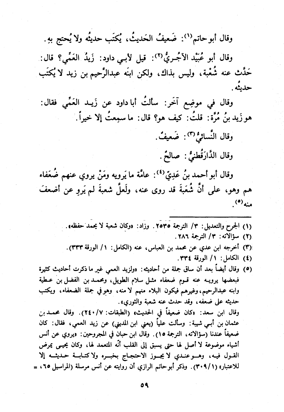 (5) وَقَال أيضا بعد أن ساق جملة من أحاديثه: ولزيد العمي غير ما ذكرت أحاديث كثيرة فبعضها يرويه عنه قوم ضعفاء مثل سلام الطويل، ومحمد بْن الفضل بْن عطية وابنه عَبد الرحيم، وغيرهم فيكون البلاء منهم لا منه، وهو في جملة الضعفاء، ويكتب حديثه على ضعفه، وقد حدث عنه شعبة والثوري". وَقَال ابن سعد: كان ضعيفا في الحديث" (الطبقات: 7 / 240) . وَقَال محمد بن عثمان بن أَبي شَيْبَة: وسألت عليا (يعني ابن المديني) عن زيد العمي، فقال: كان ضعيفا عندنا (سؤالاته، الترجمة 15) .