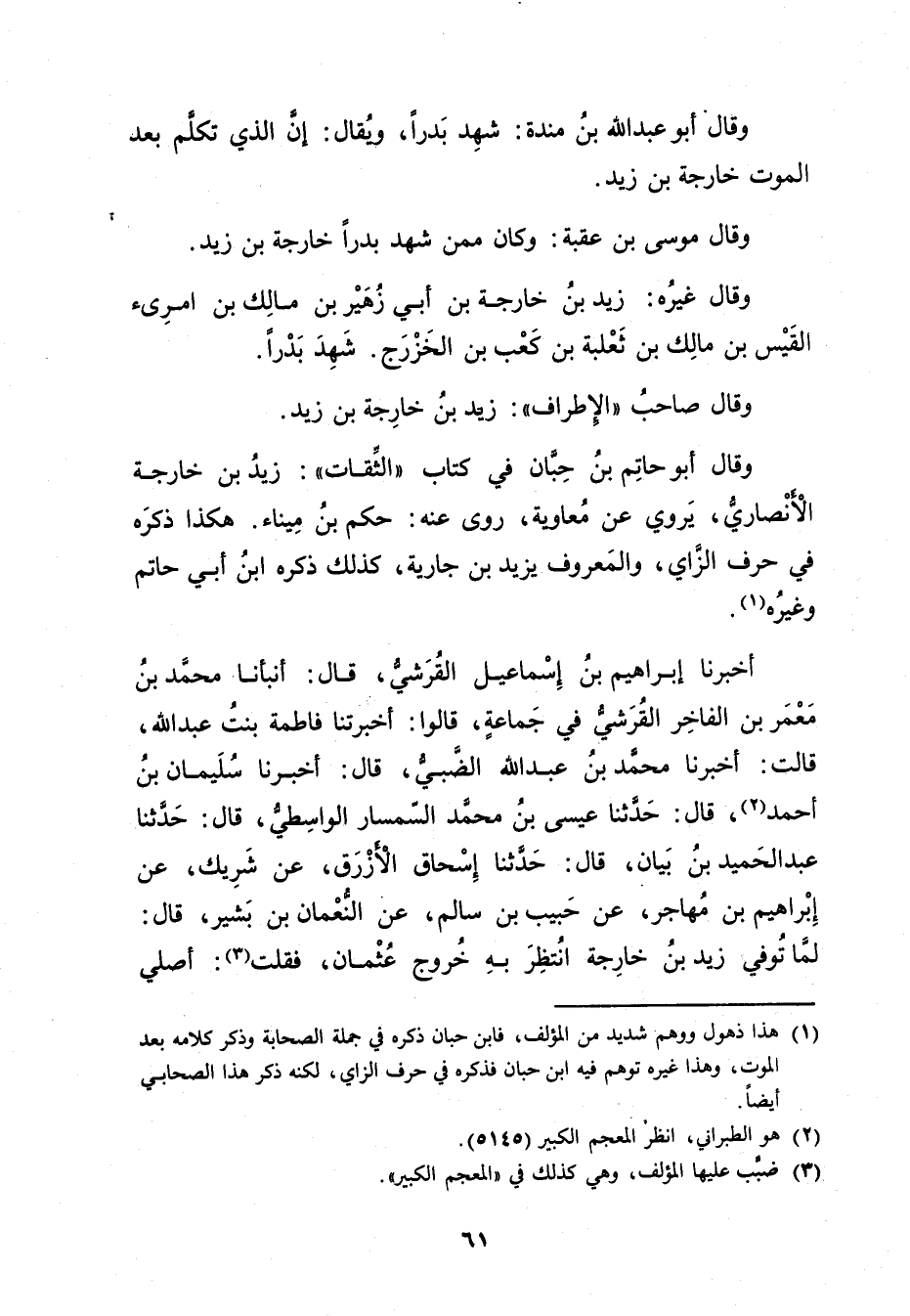أَخْبَرَنَا إِبْرَاهِيمُ بْنُ إِسْمَاعِيلَ الْقُرَشِيُّ، قال: أَنْبَأَنَا مُحَمَّدُ بْنُ مَعْمَرِ بْنِ الْفَاخِر الْقُرَشِيّ فِي جماعة، قَالُوا: أَخْبَرَتْنا فَاطِمَةُ بِنْتُ عَبد اللَّهِ، قَالَتْ: أخبرنا مُحَمَّدُ بْنُ عَبد اللَّهِ الضَّبِّيُّ، قال: أخبرنا سُلَيْمان بْن أَحْمَد (2) ، قال: حَدَّثَنَا عِيسَى بْن مُحَمَّد السمسار الواسطي، قال: حَدَّثَنَا عبد الحميد بْن بيان، قال: حَدَّثَنَا إِسْحَاق الأزرق، عَنْ شَرِيك، عَنْ إِبْرَاهِيم بْن مهاجر، عَنْ حَبِيب بْن سالم، عن النعمان بْن بشير، قال: لما توفي زَيْد بْن خَارِجَة انتظر بِهِ خروج عُثْمَان، فقلت (3) : أصلي