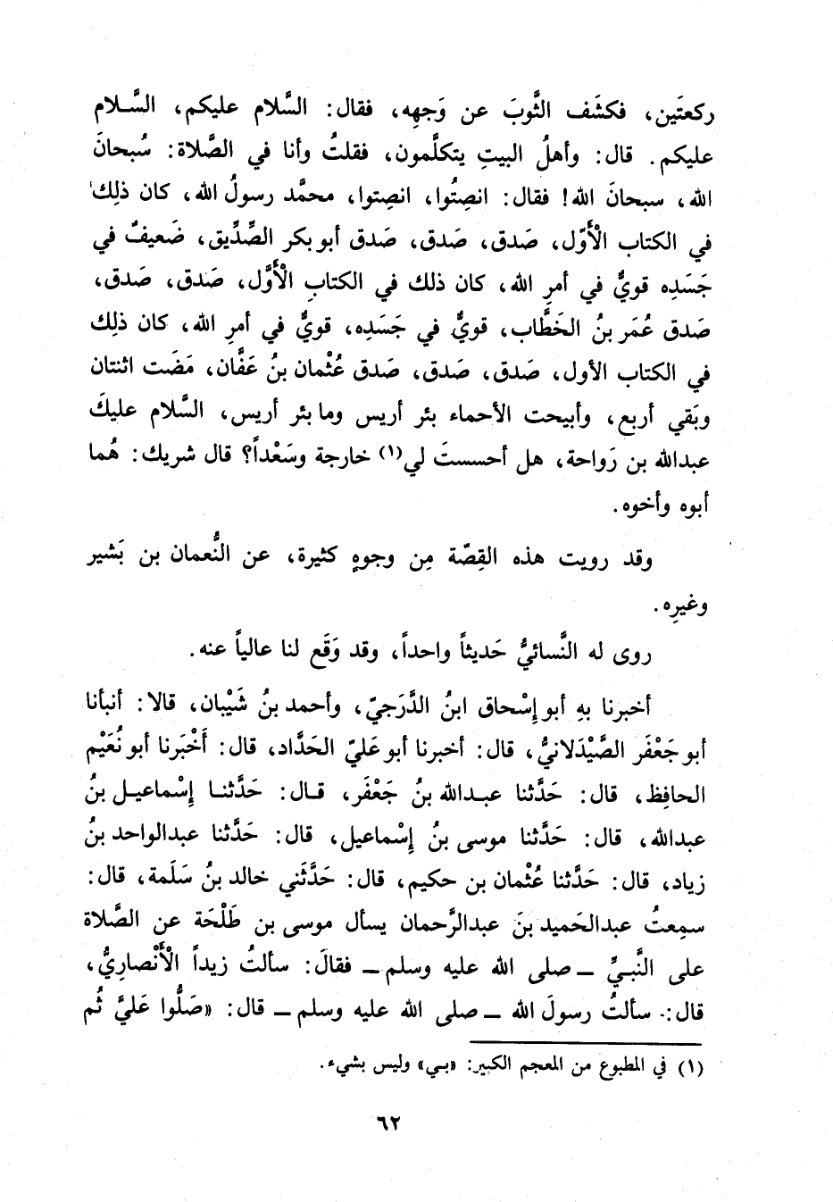 ركعتين، فكشف الثوب عَنْ وجهه، فَقَالَ: السلام عليكم، السلام عليكم. قال: وأهل البيت يتكلمون، فقلت وأنا فِي الصلاة: سبحان الله، سبحان الله! فَقَالَ: انصتوا، انصتوا، مُحَمَّد رَسُول اللَّهِ، كَانَ ذَلِكَ فِي الكتاب الأول، صدق، صدق، صدق أَبُو بَكْر الصديق، ضعيف فِي جسده قوي فِي أمر اللَّهِ، كَانَ ذَلِكَ فِي الكتاب الأول، صدق، صدق، صدق عُمَر بْن الخطاب، قوي فِي جسده، قوي فِي أمر الله، كَانَ ذَلِكَ فِي الكتاب الأول، صدق، صدق، صدق عُثْمَان بْن عَفَّان، مضت اثنتان وبقي أربع، وأبيحت الأحماء بئر أريس وما بئر أريس، السلام عليك عَبد اللَّهِ بْن رواحة، هل أحسست لي (1) خَارِجَة وسعدا؟ قال شَرِيك: هما أبوه وأخوه.
