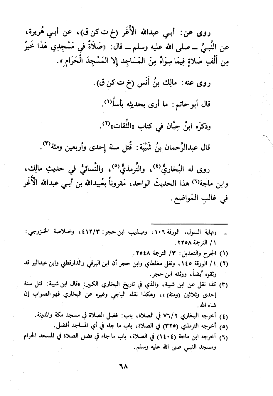 روى عن: أَبِي عَبد اللَّهِ الأَغَر (خ ت كن ق) ، عَن أَبِي هُرَيْرة، عَنِ النَّبِيِّ صلى الله عليه وسلم قال: صَلاةٌ فِي مَسْجِدِي هَذَا خَيْرٌ مِنْ أَلْفِ صَلاةٍ فِيمَا سِوَاهُ مِنَ الْمَسَاجِدِ إِلا الْمَسْجِدِ الْحَرَامِ.