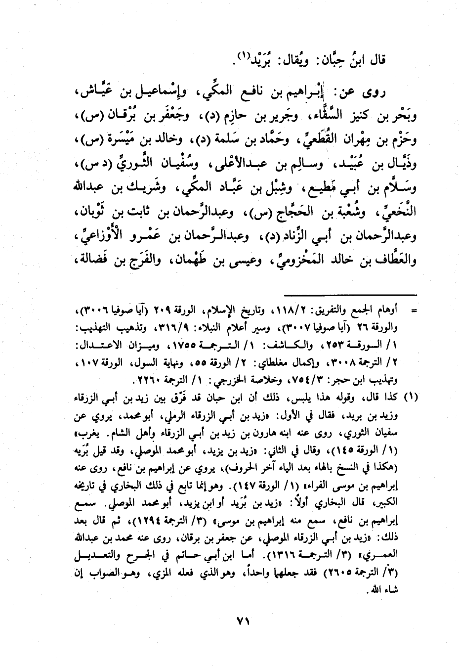 (1) كذا قال، وقوله هذا يلبس، ذلك أن ابن حبان قد فرق بين زيد بن أَبي الزرقاء وزيد بن بريد، فقال في الاول: زيد بن أَبي الزرقاء الرملي، أبو محمد، يروي عن سفيان الثوري، روى عنه ابنه هارون بن زيد بن أَبي الزرقاء وأهل الشام. يغرب" (1 / الورقة 145) ، وَقَال في الثاني: زيد بن بريد، أبو محمد الموصلي، وقد قيل بريه (هكذا في النسخ بالهاء بعد الياء آخر الحروف) ، يروي عن إبراهيم بن نافع، روى عنه إبراهيم بن موسى الفراء" (1 / الورقة 147) . وهو إنما تابع في ذلك البخاري في تاريخه الكبير، قال البخاري أولا: زيد بن بريد أو ابن يزيد، أبو محمد الموصلي.