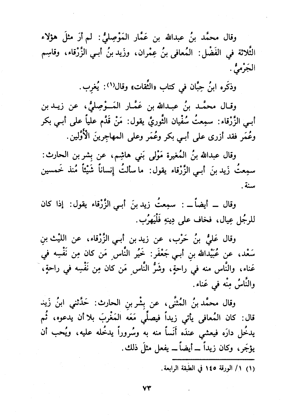وَقَال مُحَمَّد بْن عَبد الله بْن عمار الموصلي، عن زيد بْن أَبي الزرقاء: سمعت سُفْيَان الثوري يَقُول: من قدم عليا على أَبِي بَكْر وعُمَر فقد أزرى على أَبِي بَكْر وعُمَر وعلى المهاجرين الأولين.