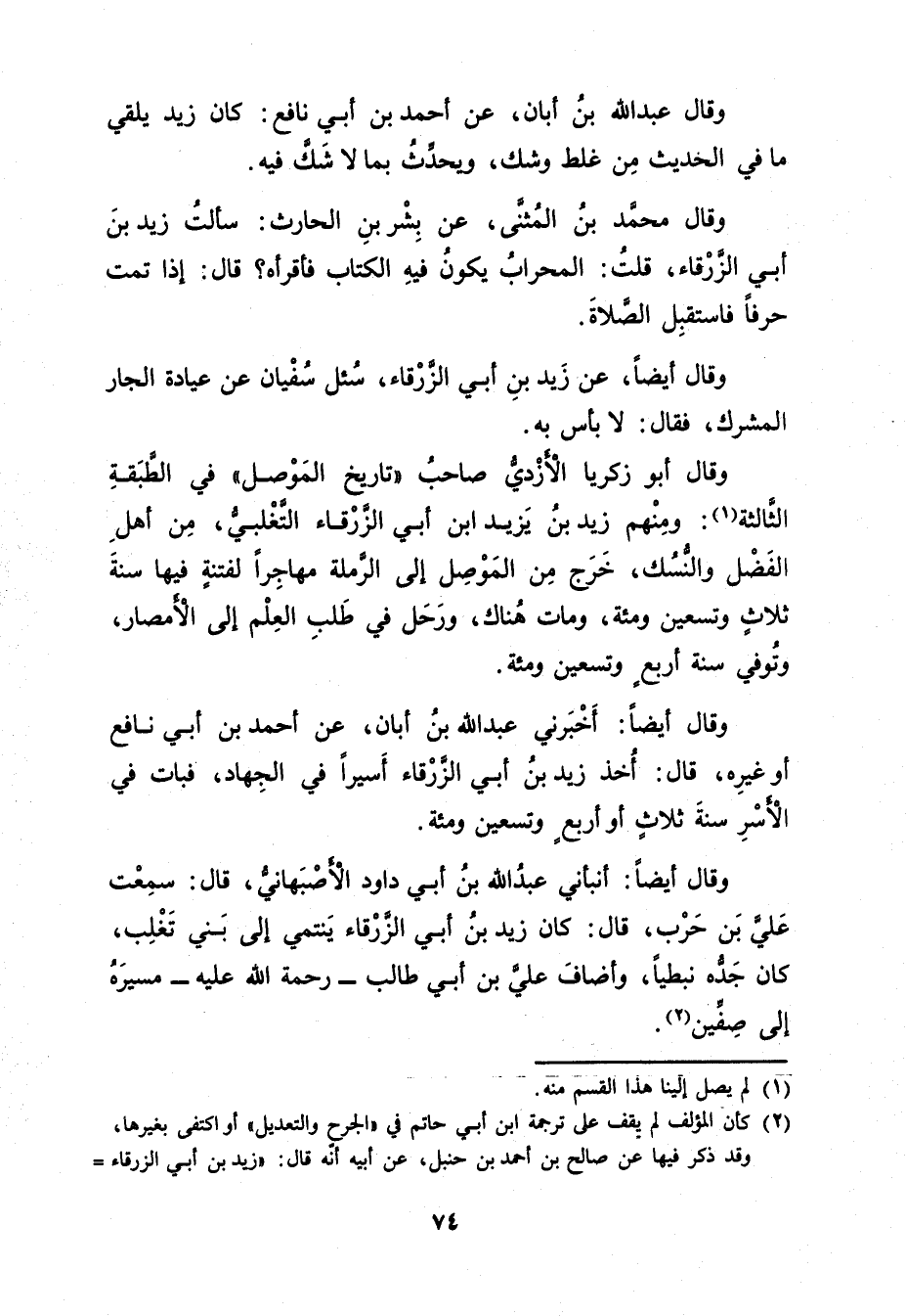 وَقَال أيضا: أنبأني عَبد اللَّهِ بْن أَبي دَاوُد الأصبهاني، قال: سمعت علي بْن حرب، قال: كَانَ زَيْد بْن أَبي الزرقاء ينتمي إِلَى بني تغلب، كَانَ جده نبطيا، وأضاف علي بْن أَبي طَالِب - رحمة الله عليه - مسيره إلى صفين (2) .