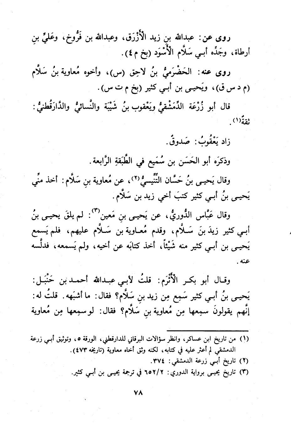 وَقَال عَباس الدُّورِيُّ، عَنْ يحيى بْن مَعِين (3) : لم يلق يَحْيَى بْن أَبي كثير زَيْد بْن سَلام، وقدم معاوية بْن سَلام عليهم، فلم يسمع يَحْيَى بْن أَبي كثير منه شيئا، أخذ كتابه عَنْ أخيه، ولم يسمعه، فدلسه عنه.