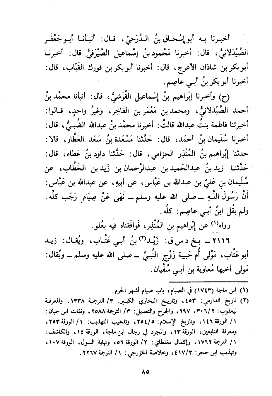 (ح) وأَخْبَرَنَا إِبْرَاهِيمُ بْنُ إِسْمَاعِيلَ الْقُرَشِيُّ، قال: أَنْبَأَنَا مُحَمَّدُ بْنُ أَحْمَدَ الصَّيْدَلانِيُّ، ومُحَمَّدُ بْنُ مَعْمَرِ بْنِ الْفَاخِرِ، وغَيْرُ واحِدٍ، قَالُوا: أَخْبَرَتْنَا فَاطِمَةُ بنت عَبد اللَّه قال: أخبرنا مُحَمَّد بْنُ عَبد اللَّهِ الضَّبِّيُّ، قال: أخبرنا سُلَيْمان بْنُ أَحْمَدَ، قال: حَدَّثَنَا مسعدة بْن سَعْد الْعَطَّار، قَالا: حَدَّثَنَا إِبْرَاهِيم بْن المنذر الحزامي، قال: حَدَّثَنَا دَاوُد بْن عَطَاء، قال: حَدَّثَنَا زَيْد بْن عبد الحميد بن عَبْد الرحمن بن زيد بْن الخطاب، عَنْ سُلَيْمان بْن علي بْن عَبد اللَّهِ بْن عَبَّاسٍ، عَن أَبِيهِ، عَنْ عَبد اللَّهِ بْن عَبَّاس: أن رَسُول اللَّهِ صلى الله عليه وسلم نهى عَنْ صيام رجب كله. ولم يقل ابْن أَبي عاصم: كله.