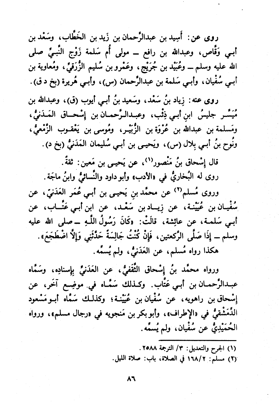 وورى مُسْلِم (2) عَنْ مُحَمَّد بْن يَحْيَى بْن أَبي عُمَر العدني، عن سفيان بْن عُيَيْنَة، عَنْ زياد بْنِ سَعْدٍ، عَنِ ابْنِ أَبي عَتَّاب، عَن أَبِي سَلَمَة، عَنْ عَائِشَةَ، قَالَتْ: كَانَ رَسُولُ اللَّهِ صلى الله عليه وسلم إِذَا صلى الركعتين، فإن كنت جالسة حَدَّثَنِي وإلا اضطجع.