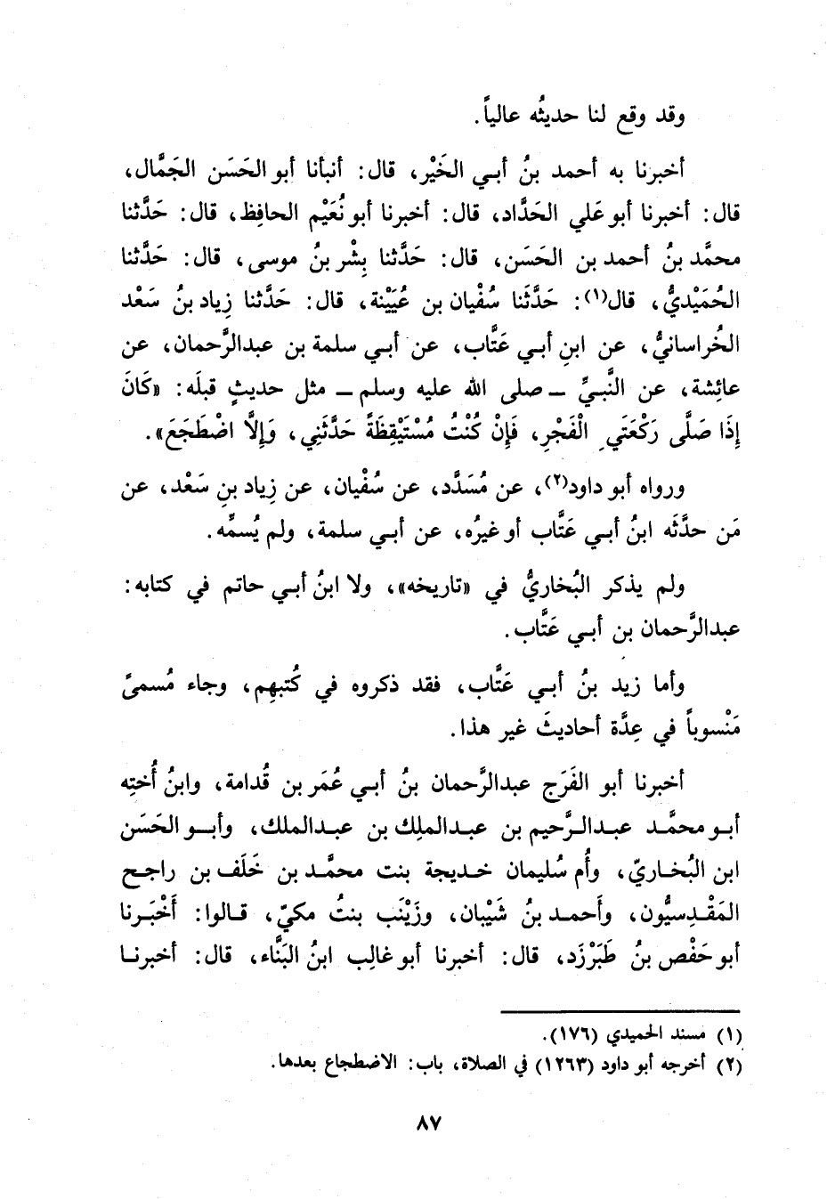أَخْبَرَنَا بِهِ أَحْمَد بْن أَبي الْخَيْرِ، قال: أَنْبَأَنَا أَبُو الْحَسَنِ الجمال، قال: أَخْبَرَنَا أبو علي الحداد، قال: أَخْبَرَنَا أبو نعيم الحافظ، قال: حَدَّثَنَا مُحَمَّدُ بْنُ أحمد بْن الحسن، قال: حَدَّثَنَا بشر بْن موسى، قال: حَدَّثَنَا الحميدي، قال (1) : حَدَّثَنَا سفيان بْن عُيَيْنَة، قال: حَدَّثَنَا زِيَاد بْن سَعْد الخراساني، عَنِ ابْن أَبي عَتَّاب، عَن أَبِي سَلَمَة بْن عَبْدِ الرَّحْمَنِ، عن عَائِشَةَ، عن النَّبِيُّ صلى الله عليه وسلم مثل حديث قبله: كَانَ إذا صلى ركعتي الفجر، فإن كنت مستيقظة حَدَّثَنِي، وإلا اضطجع.