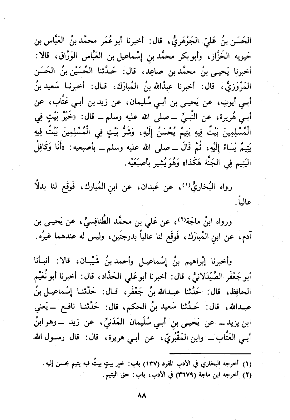 الحسن بْن علي الجوهري، قال: أخبرنا أَبُو عُمَر مُحَمَّدُ بْنُ الْعَبَّاسِ بْنِ حَيَّوَيْهِ الْخَزَّازُ، وأَبُو بكر مُحَمَّد بْن إِسْمَاعِيل بْن العباس الوراق، قَالا: أَخْبَرَنَا يَحْيَى بْن مُحَمَّد بْن صاعد، قال: حَدَّثَنَا الْحُسَيْنُ بْنُ الْحَسَنِ الْمَرْوَزِيُّ، قال: أَخْبَرَنَا عَبد الله بْن الْمُبَارَكِ، قال: أَخْبَرَنَا سَعِيد بْنُ أَبي أَيُّوبَ، عَنْ يَحْيَى بْنِ أَبي سُلَيْمان، عَنْ زَيْدِ بْنِ أَبي عَتَّابٍ، عَن أَبِي هُرَيْرة، عَنِ النَّبِيِّ صلى الله عليه وسَلَّمَ قال: خَيْرُ بَيْتٍ فِي الْمُسْلِمِينَ بَيْتٌ فِيهِ يَتِيمٌ يُحْسَنُ إِلَيْهِ، وشَرُّ بَيْتٍ فِي الْمُسْلِمِينَ بَيْتٌ فِيهِ يَتِيمٌ يُسَاءُ إِلَيْهِ، ثُمَّ قال صَلَّى اللَّهُ عَلَيْهِ وسَلَّمَ بِأُصْبُعَيْهِ: أَنَا وكَافِلُ الْيَتِيمِ فِي الْجَنَّةِ هَكَذَا"وهُوَ يُشِيرُ بِأُصْبُعَيْهِ.