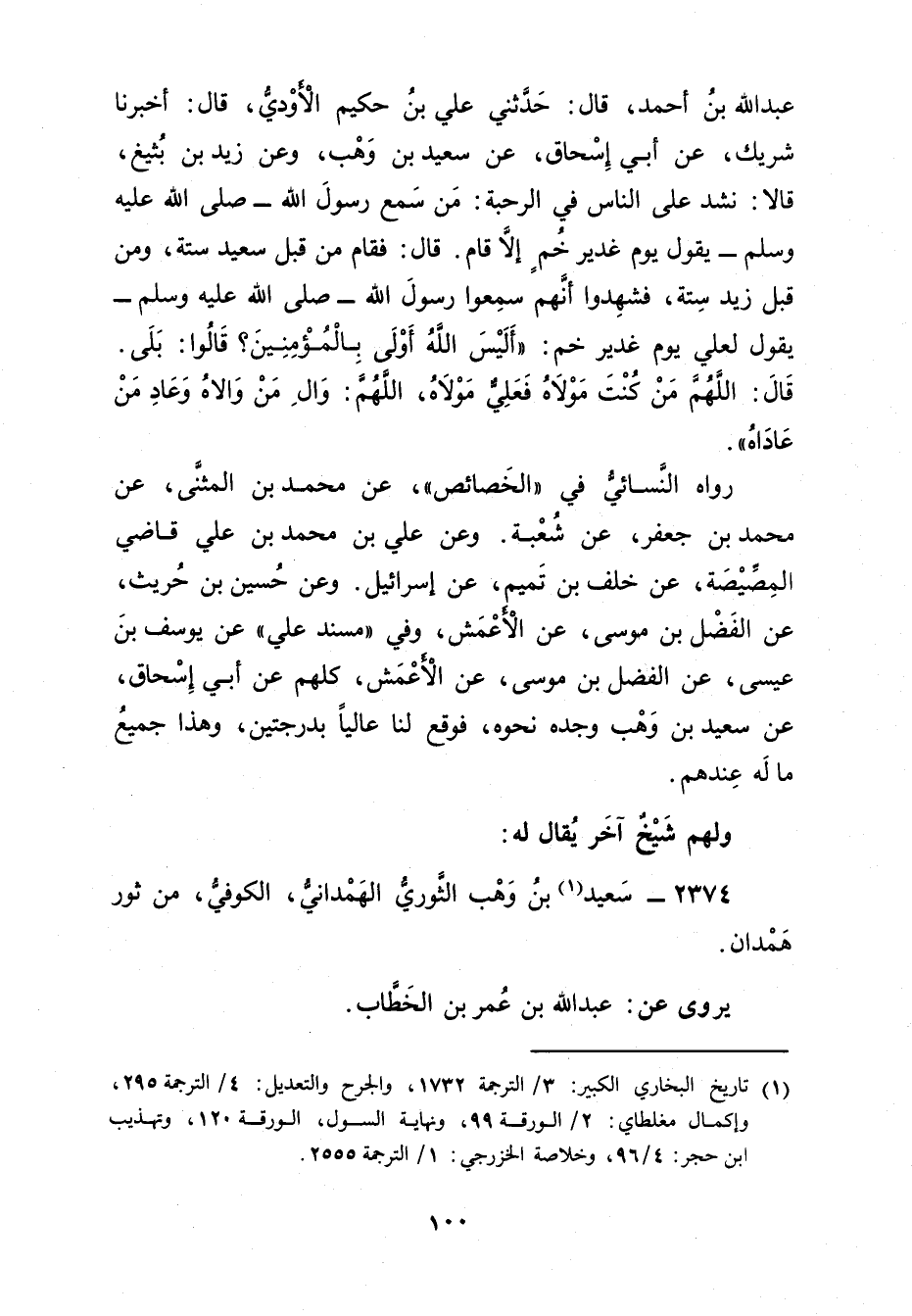 عَبد اللَّهِ بْن أَحْمَدَ، قال: حَدَّثَنِي عَلِيُّ بْنُ حَكِيمٍ الأَودِيّ، قال: أَخْبَرَنَا شَرِيك، عَن أَبِي إِسْحَاقَ، عَنْ سَعِيد بْن وهب، وعن زيد بن بثبغ، قَالا: نَشَدَ عَلِيٌّ النَّاسَ فِي الرَّحْبَةِ: مَنْ سَمِعَ رَسُولَ اللَّهِ صَلَّى اللَّهُ عَلَيْهِ وسَلَّمَ يقول يَوْمَ غَدِيرِ خُمٍّ إِلا قَامَ. قال: فَقَامَ مِنْ قِبَلِ سَعِيد سِتَّةٌ، ومِنْ قِبَلِ زَيْدٍ سِتَّةٌ، فَشَهِدُوا أَنَّهُمْ سَمِعُوا رَسُولَ اللَّهِ صَلَّى اللَّهُ عَلَيْهِ وسَلَّمَ يقول لِعَلِيٍّ يَوْمَ غَدِيرِ خُمٍّ: أَلَيْسَ اللَّهُ أَوْلَى بِالْمُؤْمِنِينَ؟ قَالُوا: بَلَى. قال: اللَّهُمَّ مَنْ كُنْتُ مَوْلاهُ فَعَلِيٌّ مَوْلاهُ، اللَّهُمَّ: والِ مَنْ والاهُ وعَادِ مَنْ عَادَاهُ.