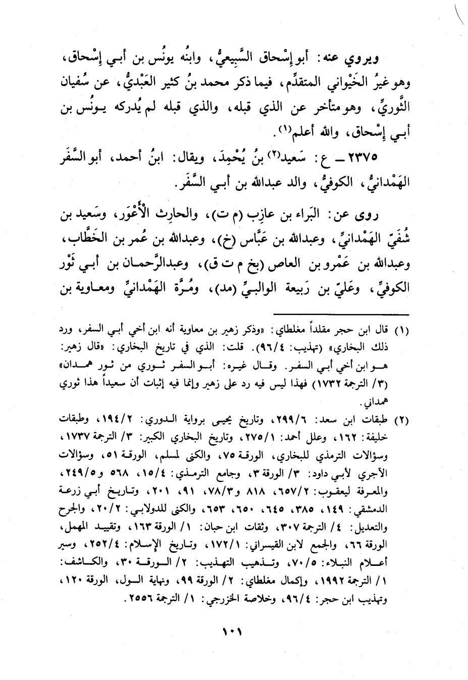 2375 - ع: سَعِيد بن يحمد (2) ، ويُقال: ابْن أَحْمَدَ، أبو السفر الهمداني، الكوفي، والد عَبد اللَّهِ بن أَبي السفر.