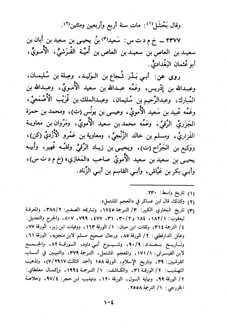 2377 - خ م د ت س: سَعِيد بْن يحيى بْن سَعِيد بن أبان بن سَعِيد بن العاص بن سَعِيد بن العاص بن أمية الْقُرَشِيّ (3) ، الأُمَوِي، أبو عُثْمَان البغدادي.