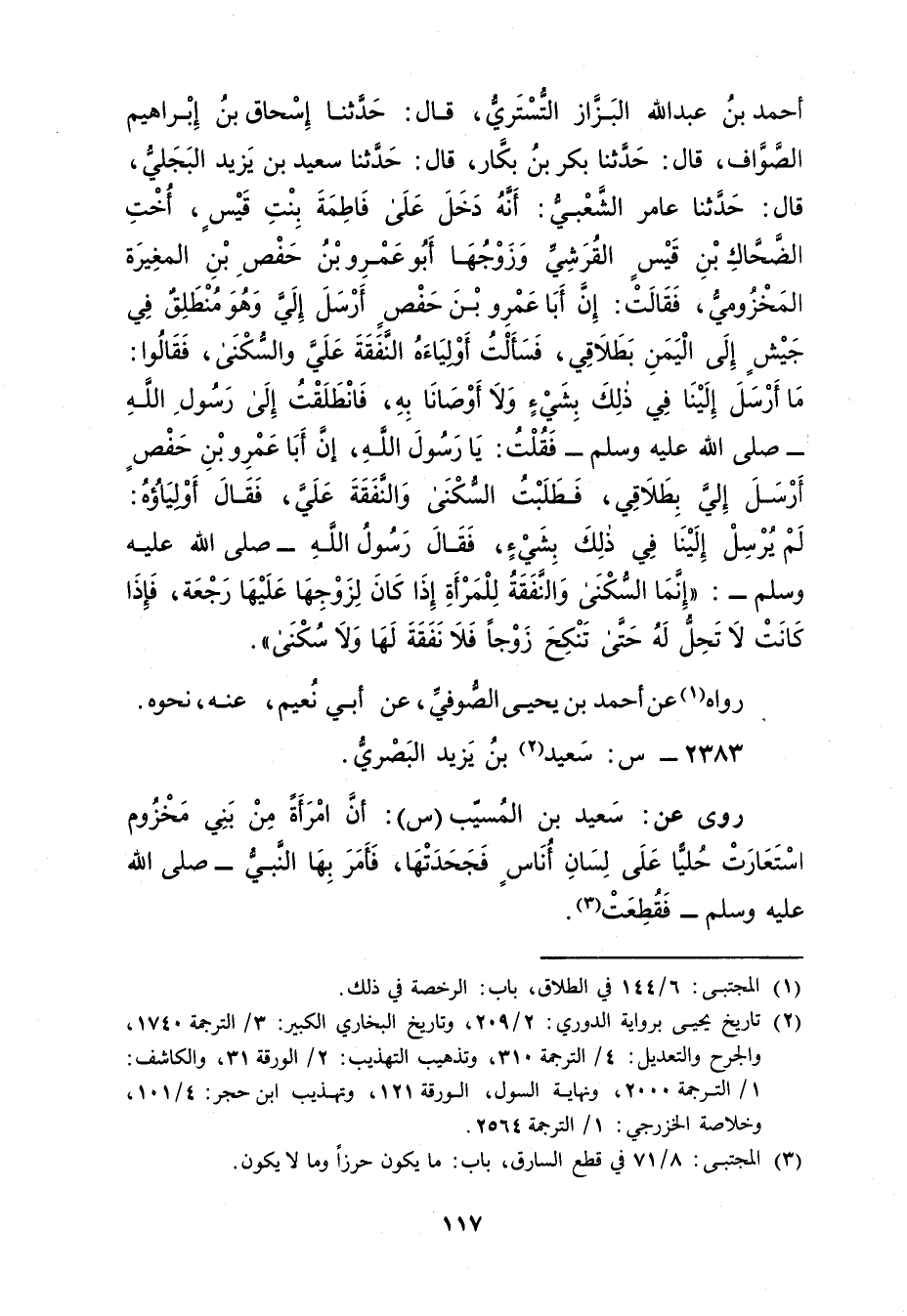 الصَّوَّافُ، قال: حَدَّثَنَا بَكْرُ بْنُ بَكَّارٍ، قال: حَدَّثَنَا سَعِيد بْنُ يَزِيدَ الْبَجْلِيُّ، قال: حَدَّثَنَا عَامِرٌ الشَّعْبِيُّ: أَنَّهُ دَخَلَ عَلَى فَاطِمَةَ بِنْتِ قَيْسٍ، أُخْتُ الضَّحَّاكِ بْنِ قَيْسٍ الْقُرَشِيِّ وزَوْجُهَا أَبُو عُمَر وبن حَفْصِ بْنِ الْمُغِيرَةِ الْمَخْزُومِيُّ، فَقَالَتْ: أَنَّ أَبَا عَمْرو بْنِ حَفْصٍ أَرْسَلَ إِلَيَّ وهُوَ مُنْطَلِقٌ فِي جَيْشٍ إِلَى الْيَمَنِ بِطَلاقِي، فَسَأَلْتُ أَوْلِيَاءَهُ النَّفَقَةَ عَلَيَّ والسُّكْنَى، فَقَالُوا: مَا أَرْسَلَ إِلَيْنَا فِي ذَلِكَ بشيءٍ ولا أَوْصَانَا بِهِ، فَانْطَلَقْتُ إِلَى رَسُولِ اللَّهِ صَلَّى اللَّهُ عَلَيْه وسَلَّمَ فَقُلْتُ: يَا رَسُولَ اللَّهِ، إِنَّ أَبَا عَمْرو بْنِ حَفْصٍ أَرْسَلَ إِلَيَّ بِطَلاقِي، فَطَلَبْتُ السُّكْنَى والنَّفَقَةَ عَلَيَّ، فَقَالَ أَوْلِيَاؤُهُ: لَمْ يُرْسِلْ إِلَيْنَا فِي ذَلِكَ بشيءٍ، فَقَالَ رَسُولُ اللَّهِ صَلَّى اللَّهُ عَلَيْهِ وسَلَّمَ: إِنَّمَا السُّكْنَى والنَّفَقَةُ لِلْمَرْأَةِ إِذَا كَانَ لِزَوْجِهَا عَلَيْهَا رَجْعَةٌ، فَإِذَا كَانَتْ لا تَحِلُّ لَهُ حَتَّى تَنْكِحَ زَوْجًا فَلا نَفْقَةَ لَهَا ولا سُكْنَى.