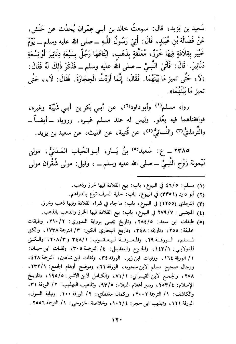 سَعِيد بْن يَزِيدَ، قال: سَمِعْتُ خَالِدَ بْنَ أَبي عِمْران يُحَدِّثُ عَنْ حَنَشٍ، عَنْ فَضَالَةَ بْنِ عُبَيد، قال: أَتَى رَسُولَ اللَّهِ صلى الله عَلَيْهِ وسَلَّمَ يَوْمَ خَيْبَرٍ بِقِلادَةٍ فِيهَا خَرَزٌ، مُعَلَّقَةٌ بِذَهَبٍ، ابْتَاعَهَا رَجُلٌ بِسَبْعَةِ دَنَانِيرَ أَوْ تِسْعَةِ دَنَانِيرَ. قال: فَأَتَى النَّبِيَّ صَلَّى اللَّهُ عَلَيْهِ وسَلَّمَ فَذَكَرَ ذَلِكَ لَهُ فَقَالَ: لا، حَتَّى تُمِيَّزَ مَا بَيْنَهُمَا. فَقَالَ: إِنَّمَا أَرَدْتُ الْحِجَارَةَ. فَقَالَ: لا، حَتَّى تُمَيِّزَ مَا بَيْنَهُمَا.