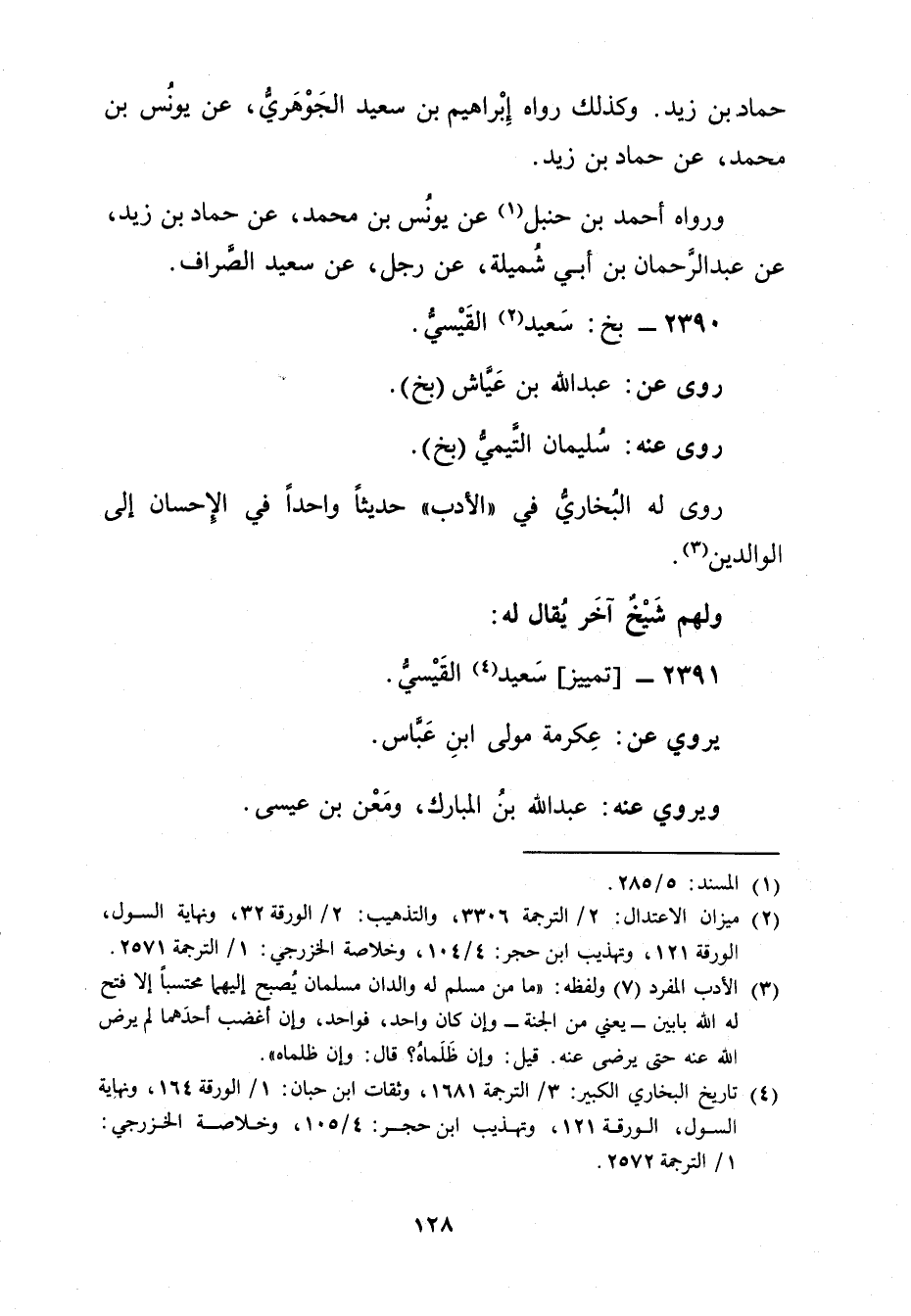 (4) تاريخ البخاري الكبير: 3 / الترجمة 1681، وثقات ابن حبان: 1 / الورقة 164، ونهاية السول، الورقة 121، وتهذيب ابن حجر: 4 / 105، وخلاصة الخزرجي: 1 / الترجمة 2572.