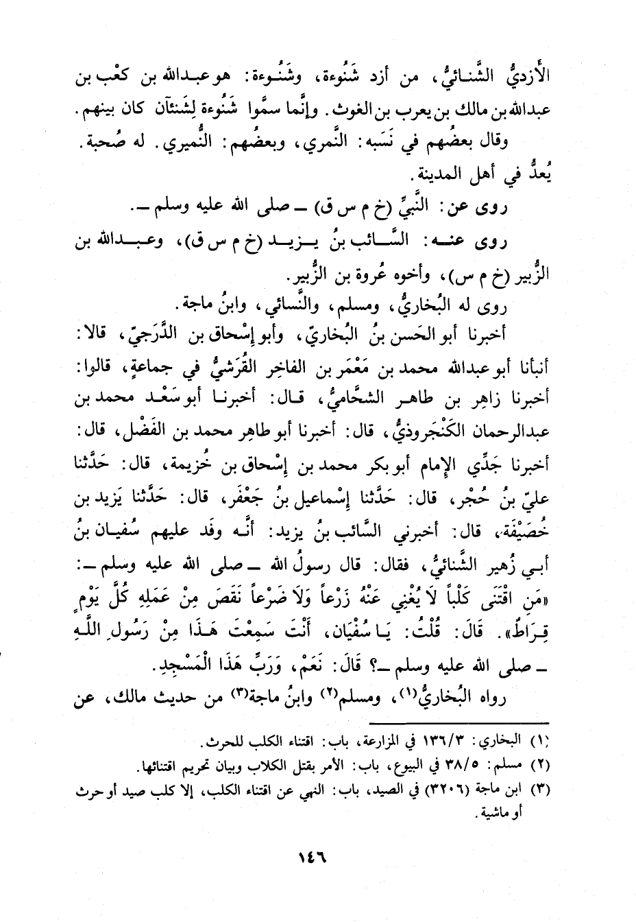 أخبرنا أَبُو الْحَسَنِ بْنُ الْبُخَارِيِّ، وأَبُو إِسْحَاقَ بْنِ الدَّرَجِيِّ، قَالا: أَنْبَأَنَا أَبُو عَبد اللَّهِ مُحَمَّدُ بْنُ مَعْمَرِ بْنِ الْفَاخِرِ الْقُرَشِيُّ فِي جَمَاعَةٍ، قَالُوا: أخبرنا زَاهِرُ بْنُ طَاهِرٍ الشَّحَّامِيُّ، قال: أَخْبَرَنَا أَبُو سَعْدٍ مُحَمَّدُ بْنُ عَبْدِ الرَّحْمَنِ الْكَنْجَرُوذِيُّ، قال: أَخْبَرَنَا أَبُو طَاهِرٍ مُحَمَّدُ بْنُ الْفَضْلِ، قال: أَخْبَرَنَا جَدِّي الإِمَامُ أَبُو بَكْر مُحَمَّدُ بْنُ إِسْحَاقَ بْنِ خُزَيْمَةَ، قال: حَدَّثَنَا عَلِيُّ بْنُ حُجْرٍ، قال: حَدَّثَنَا إِسْمَاعِيلُ بْنُ جَعْفَرٍ، قال: حَدَّثَنَا يَزِيدُ بْنُ خُصَيْفَةَ، قال: أَخْبَرَنِي السَّائِبُ بْنُ يَزِيدَ: أَنَّهُ وفَدَ عَلَيْهِمْ سُفْيَانُ بْنُ أَبي زُهَيْرٍ الشِّنَّائِيُّ، فَقَالَ: قال رَسُولُ اللَّهِ صلى الله عليه وسلم: من اقْتَنَى كَلْبًا لا يُغْنِي عَنْهُ زَرْعًا ولا ضَرْعًا نَقَصَ مِنْ عمله كل يوم قراط". قال: قُلْتُ: يَا سُفْيَانُ، أَنْتَ سَمِعْتَ هَذَا مِنْ رَسُولِ اللَّهِ صلى الله عليه وسلم؟ قال: نَعَمْ، ورَبِّ هَذَا الْمَسْجِدِ.