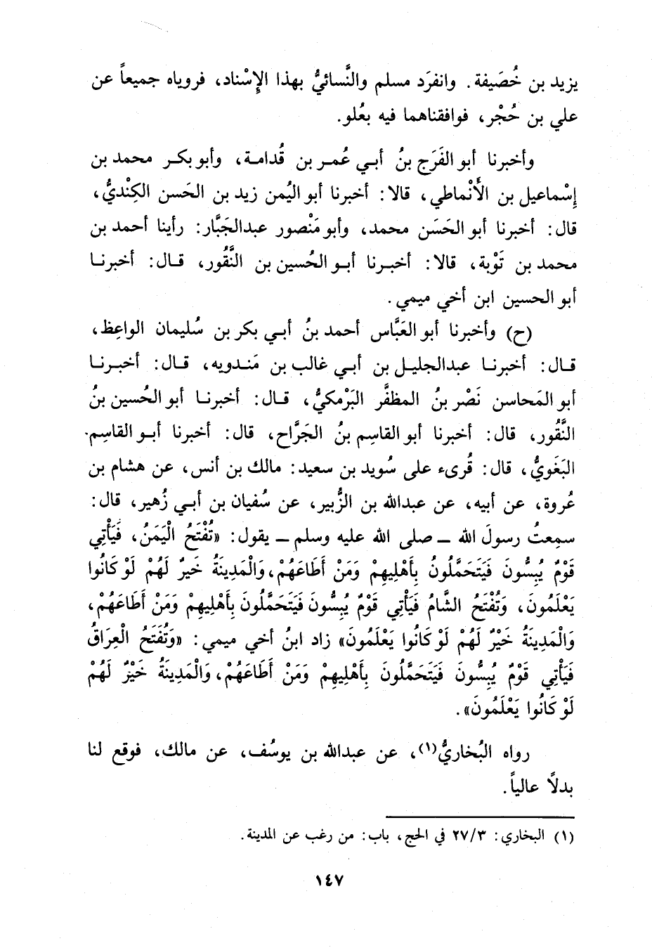 (ح) وأَخْبَرَنَا أَبُو الْعَبَّاس أَحْمَد بْن أَبي بَكْرِ بْنِ سُلَيْمان الْوَاعِظُ، قال: أَخْبَرَنَا عَبْدُ الْجَلِيلِ بْنُ أَبي غَالِبِ بْنِ مَنْدَوَيْهِ، قال: أَخْبَرَنَا أَبُو الْمَحَاسِنِ نَصْرُ بْنُ الْمُظَفَّرِ الْبَرْمَكِيُّ، قال: أخبرنا أَبُو الْحُسَيْنِ بْن النقور، قال: أَخْبَرَنَا أبو الْقَاسِمِ بْنُ الْجَرَّاحِ، قال: أَخْبَرَنَا أَبُو الْقَاسِمِ. الْبَغَوِيُّ، قال: قُرِئَ عَلَى سُوَيْدِ بْنِ سَعِيد: مَالِكِ بْنُ أَنَسٍ، عَنْ هِشَامِ بْنِ عروة، عَن أبيه، عن عَبد اللَّهِ بْنِ الزُّبَيْرِ، عَنْ سُفْيَانَ بْنِ أَبي زُهَيْرٍ، قال: سَمِعْتُ رَسُول اللَّهِ صلى الله عليه وسَلَّمَ يَقُولُ: تُفْتَحُ الْيَمَنُ، فَيَأْتِي قَوْمٌ يُبِسُّونَ فَيَتَحَمَّلُونَ بِأَهْلِيهِمْ ومَنْ أَطَاعَهُمْ، والْمَدِينَةُ خَيْرٌ لَهُمْ لَوْ كَانُوا يَعْلَمُونَ، وتُفْتَحُ الشَّامُ فَيَأْتِي قَوْمٌ يُبِسُّونَ فَيَتَحَمَّلُونَ بِأَهْلِيهِمْ ومَنْ أَطَاعَهُمْ، والْمَدِينَةُ خَيْرٌ لَهُمْ لَوْ كَانُوا يَعْلَمُونَ" زَادَ ابْنُ أَخِي ميمي: وتُفْتَحُ الْعِرَاقُ فَيَأْتِي قَوْمٌ يُبِسُّونَ فَيَتَحَمَّلُونَ بِأَهْلِيهِمْ ومَنْ أَطَاعَهُمْ، والْمَدِينَةُ خَيْرٌ لَهُمْ لَوْ كَانُوا يَعْلَمُونَ.